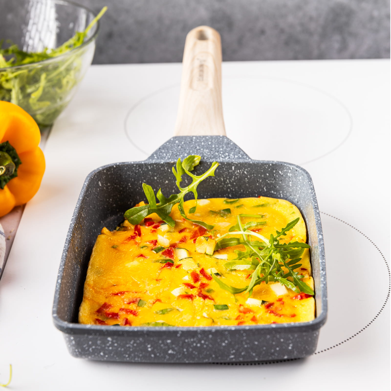 - The frying pan features a marble coating that reduces sticking during frying and facilitates healthy cooking with little or no fat.