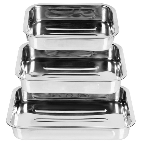 - STEEL- Set of three steel baking trays for universal use. The sheets have thick and solid side walls of the vessel and the stainless steel used in them is polished to a high gloss. The set includes: a small roasting pan measuring 27.5 x 20.5 x 5.5 cm, a medium roasting pan 32 x 24.5 x 5.5 cm, a large roasting pan 37 x 28 x 5.5 cm.