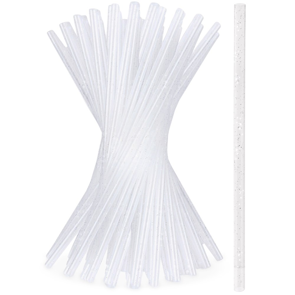 A set of 50 reusable straws for drinks made of plastic in a transparent color with glitter. Straws ideal for cold and warm drinks. They are suitable for a dishwasher.