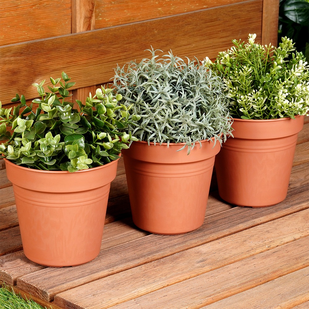 Set of 3 brick-colored flower pots. Perfect for planting herbs and flowers. The pots have a diameter of 15 cm and are resistant to weather conditions.