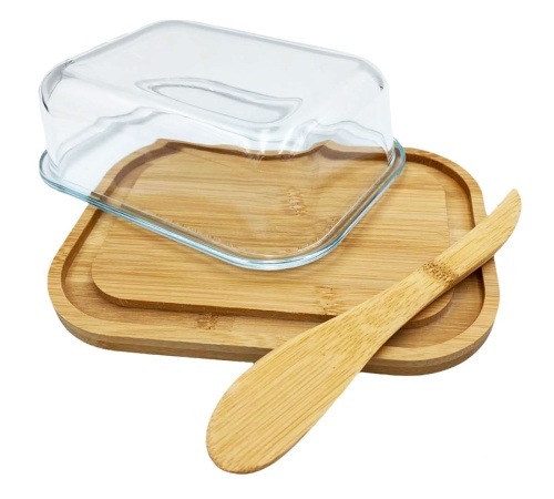 Szklana maselniczka z bambusową pokrywą. W zestawie konturowany nożyk do smarowania wykonany z drewna bambusowego. Pokrywa z bezbarwnego szkła borokrzemowego (nie zawiera BPA i ołowiu). Bambusowa pokrywa jest odporna na zarysowania i może służyć jako deseczka do krojenia masła czy serów.