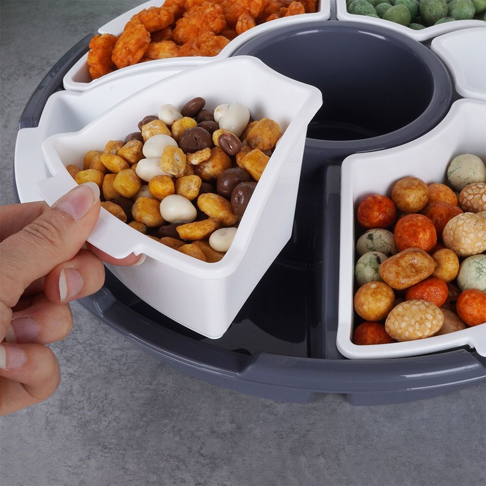 - USEFUL- Serving plate consisting of six removable inserts and a lid with a handle. The inserts come in two different sizes. The plate has a diameter of 33 cm, height 8 cm, height with lid 9 cm. There is a 9 cm diameter hole inside which can also be used for snacks.
