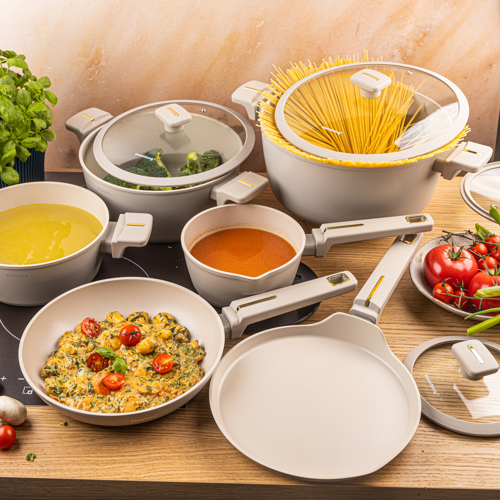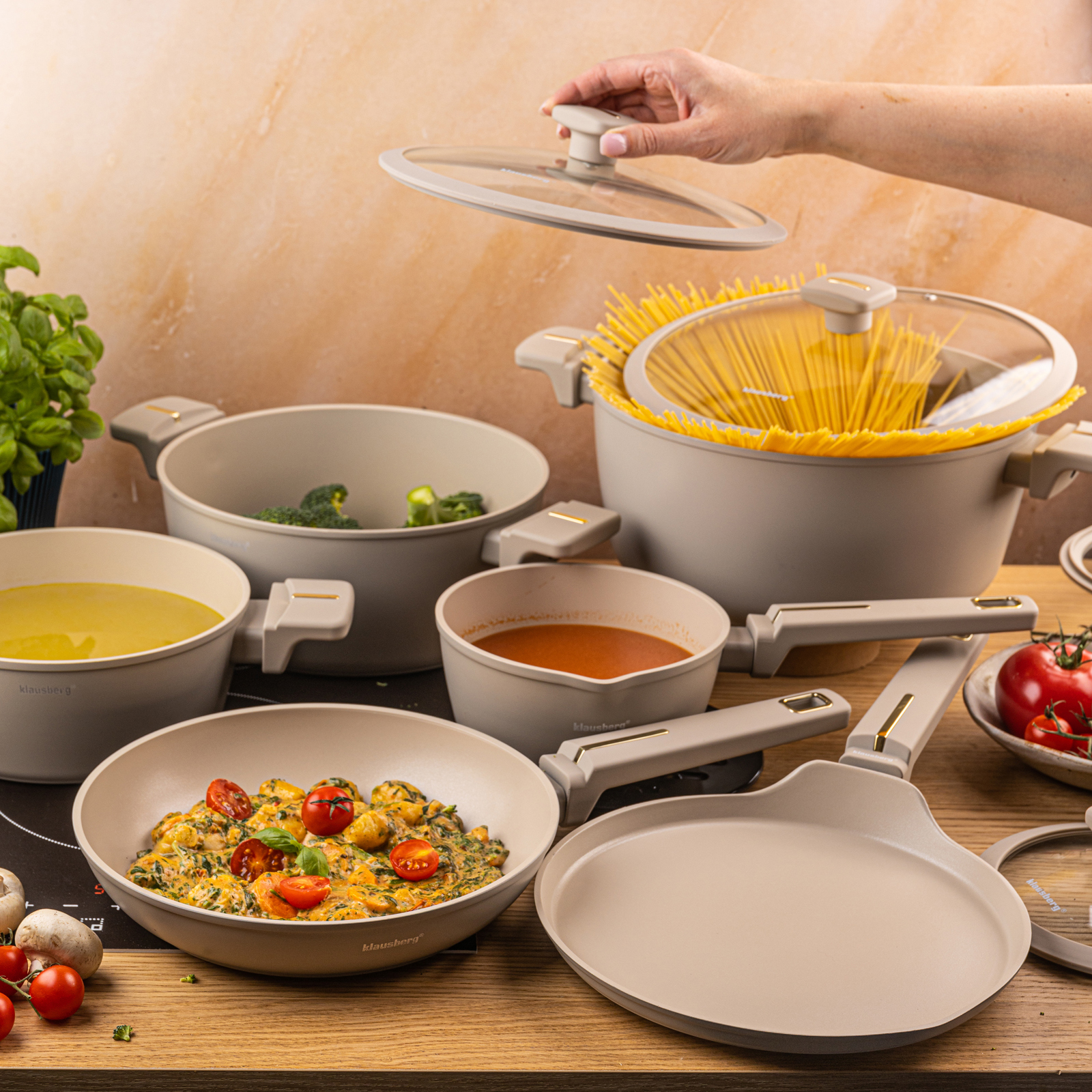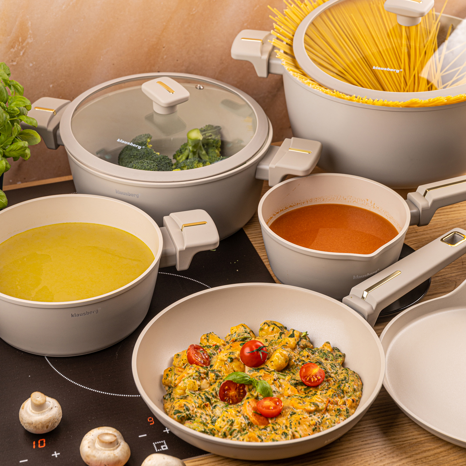 Set of pots and pans 12 pieces. pots, cast aluminum, non-stick coating, induction, beige, KLAUSBERG KB-7967