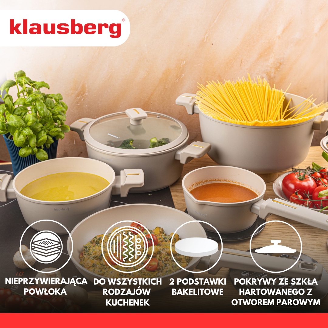 The KLAUSBERG KB-7967 set is a complete, modern set of kitchen utensils made of cast aluminum with a durable marbled non-stick coating. Thanks to its solid workmanship, elegant design and versatility, it is an ideal choice for anyone who values cooking comfort and high quality.
