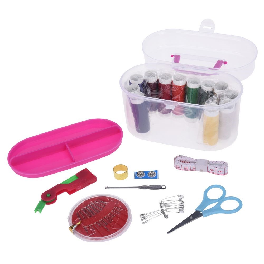 - VERSATILE- The set includes threads in different colors, needles, small scissors, a tape measure, buttons, a finger thimble, threaders and safety pins.