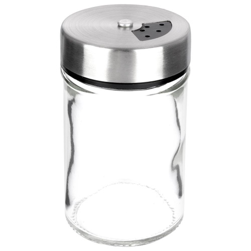 100 ml glass container for spices with a dispenser. Made of transparent glass. Suitable for washing in a dishwasher. Necessary in every home.
