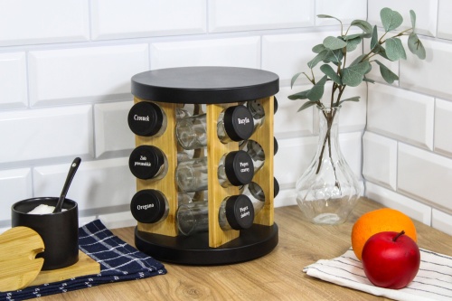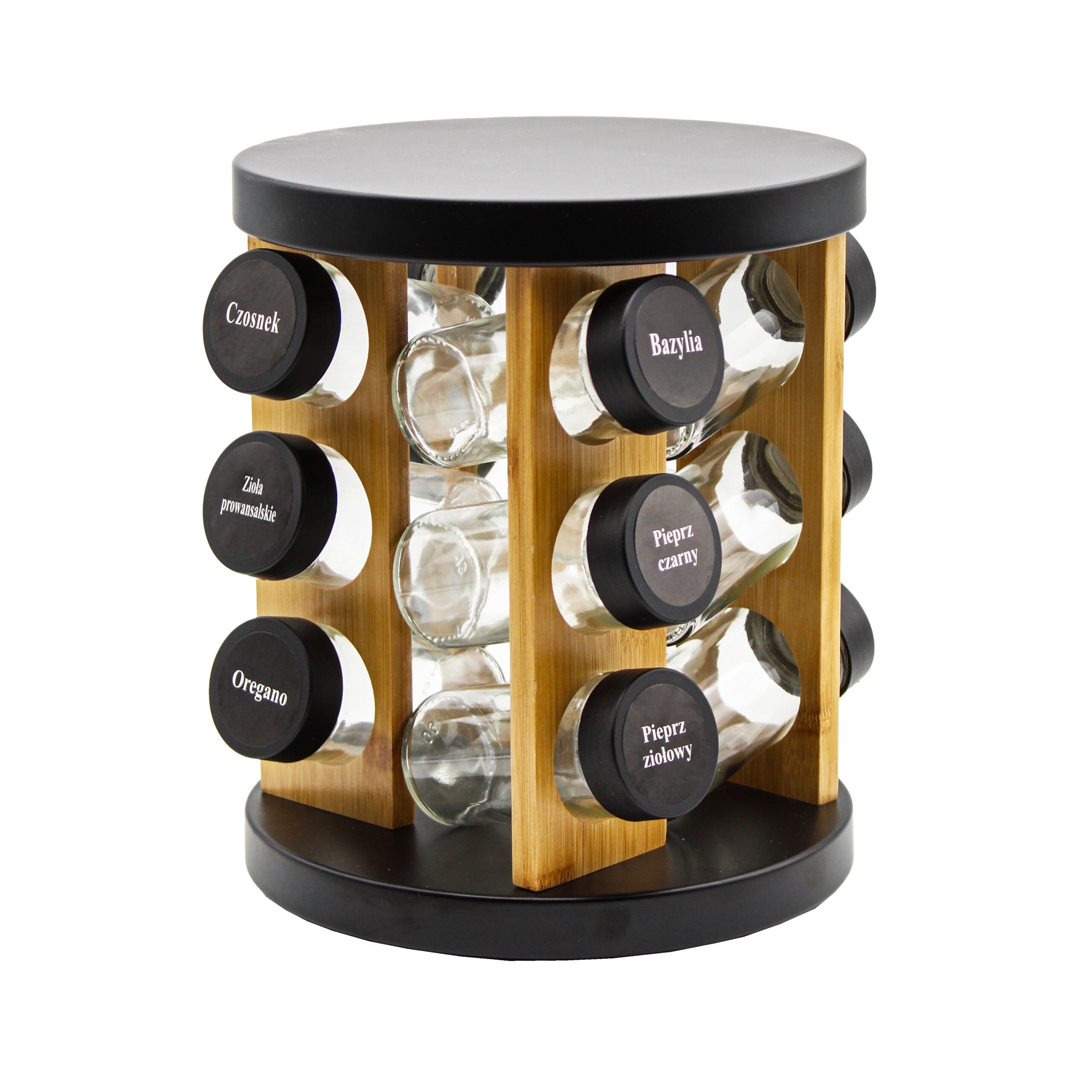The Brunbeste rotating spice rack is an elegant and practical solution for anyone who values order and functionality in the kitchen. Made of combinationnatural bamboo and black metal, combines durability with modern design. Thanks to its compact, swivel design, it ensureseasy access to 12 spicesin glass containers - always at hand when cooking.