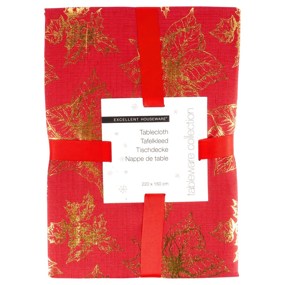 - Durable and resistant- Tablecloth made of red polyester with a beautiful, golden Christmas motif.
