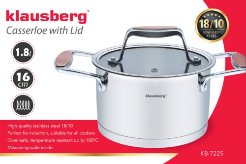 KLAUSBERG pot 1.8L with glass cover made of the highest quality 18/10 stainless steel. This type of steel guarantees long service life and resistance to spots and discoloration.