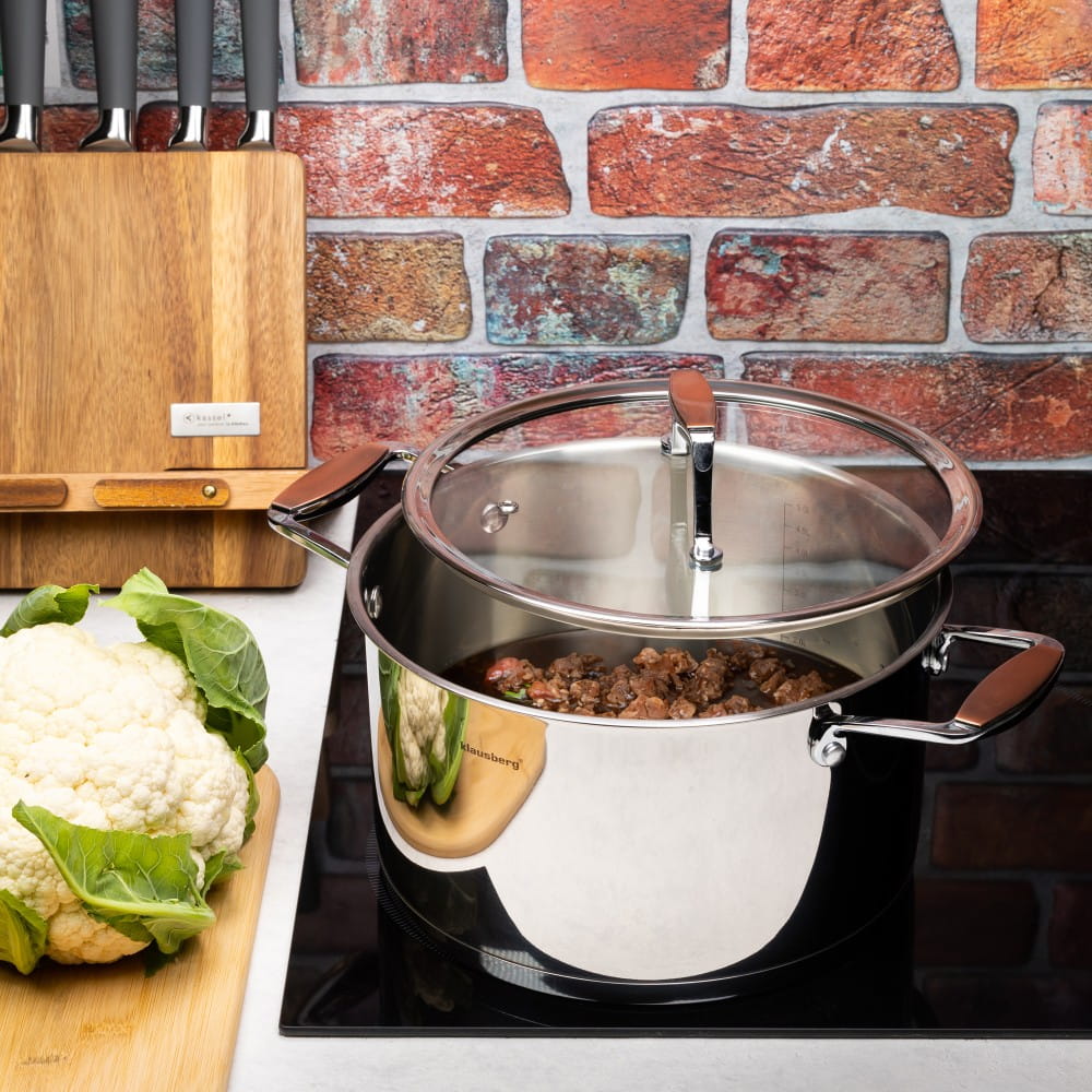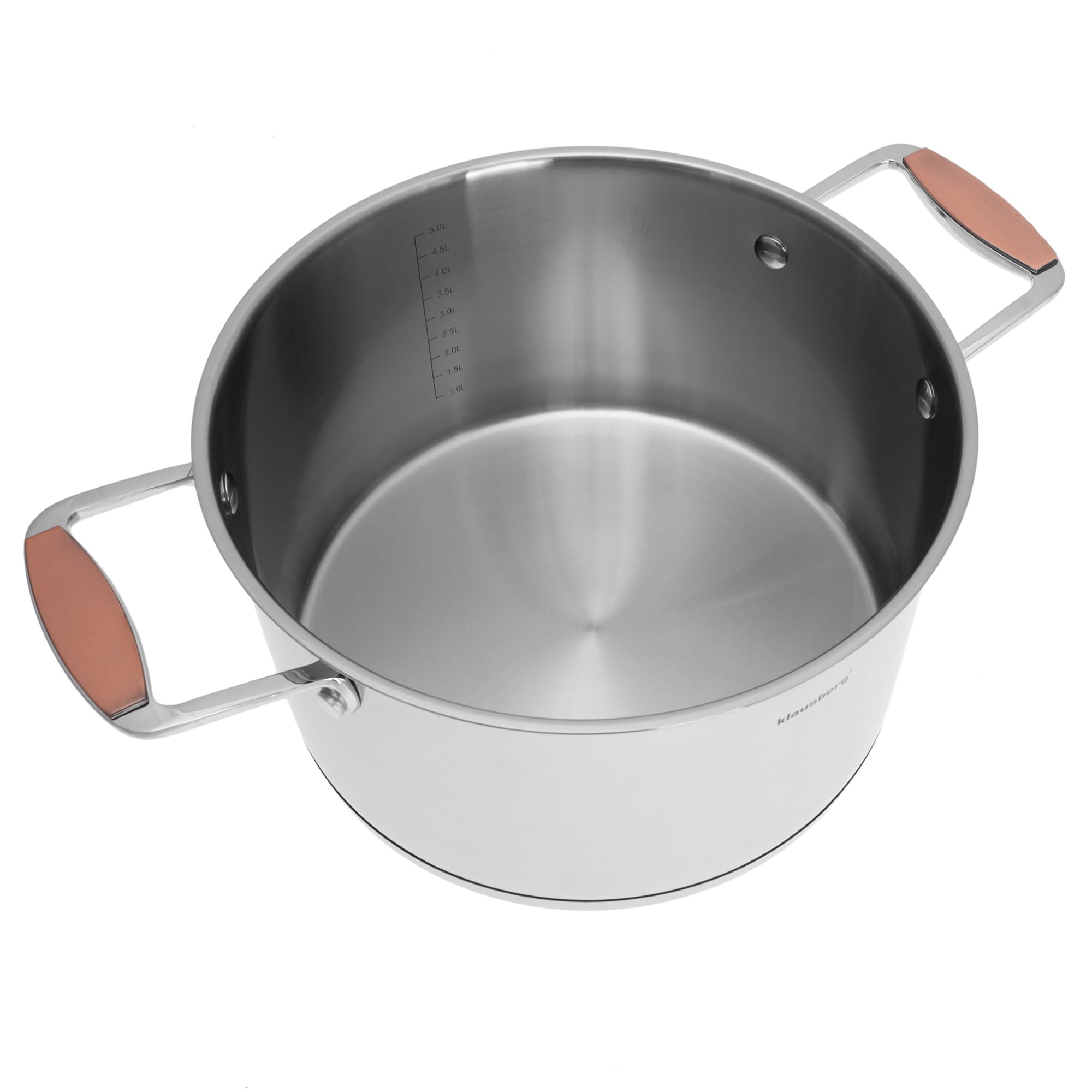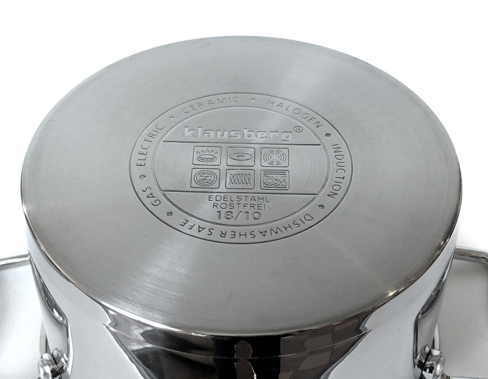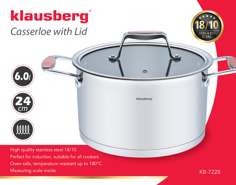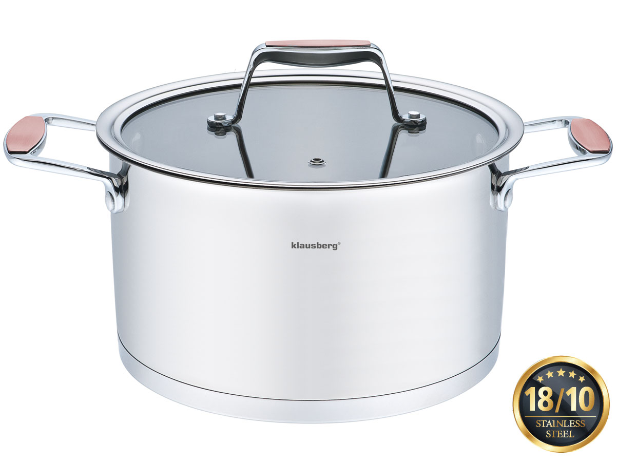 KLAUSBERG 6.0L pot with glass lid made of the highest quality 18/10 stainless steel. This type of steel guarantees a long service life and resistance to stains and discoloration.