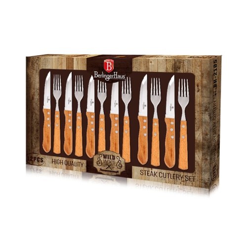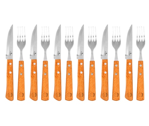 Set of 6 knives + 6 forks for steak or pizza, with wooden handles, by BERLINGER HAUS. The steak and pizza cutlery set from BERLINGER HAUS is made of stainless steel and wood. The excellent quality serrated blades allow you to cut meat with confidence and the wooden, well-shaped handle provides a secure and firm grip. The use of high-quality materials has resulted in a durable and robust product that you will enjoy for a long time.