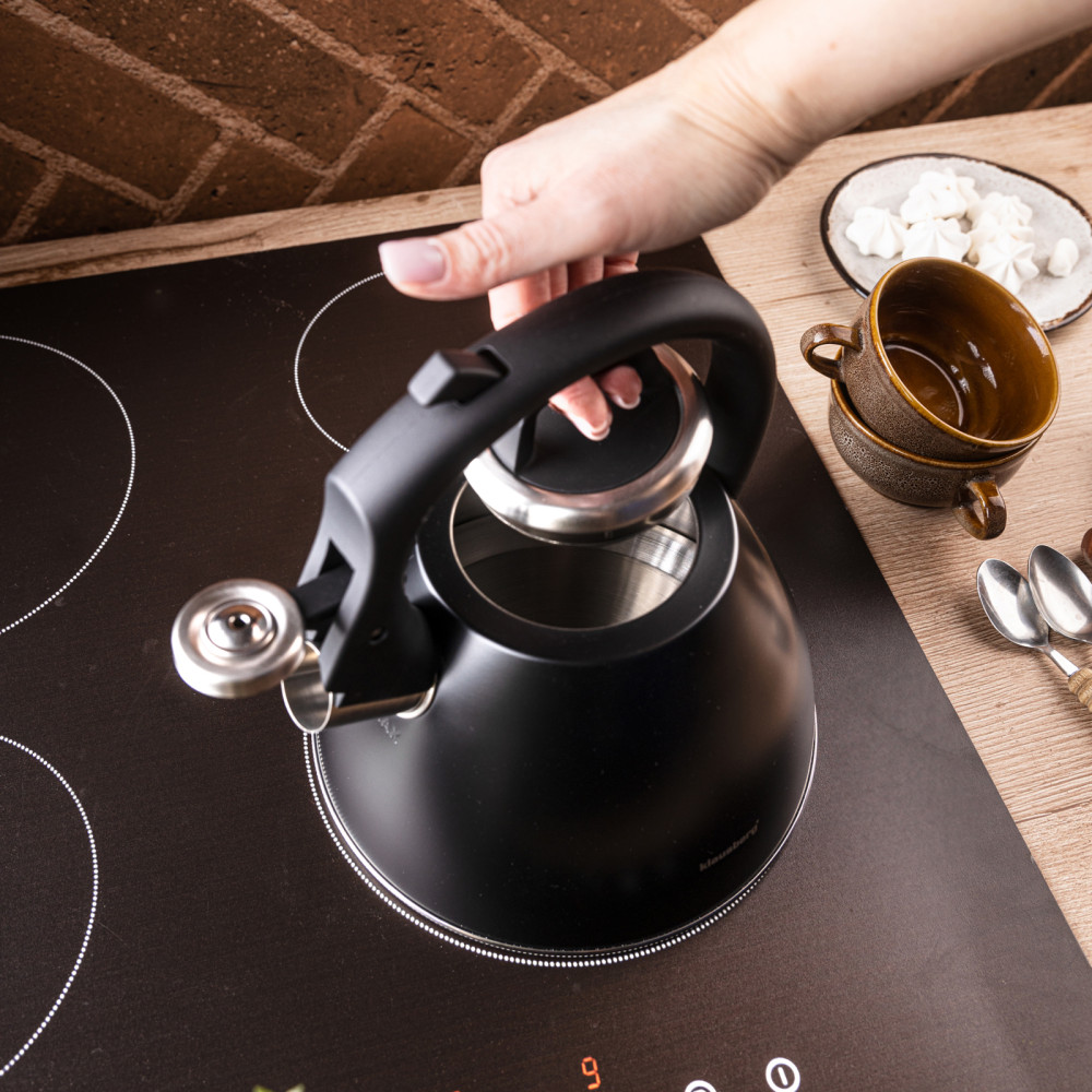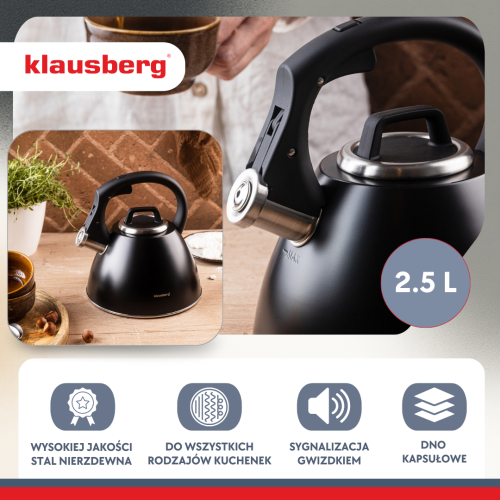 KLAUSBERG KB-7952 is an elegant kettle with a capacity of 2.5 liters, made of high-quality stainless steel and covered with a modern matte black. Equipped with a loud whistle, ergonomic Soft-Touch handle and multi-layer capsule bottom, it ensures quick heating and comfort of everyday use. Its minimalist, matte appearance makes it look great in any kitchen - modern, loft and classic.