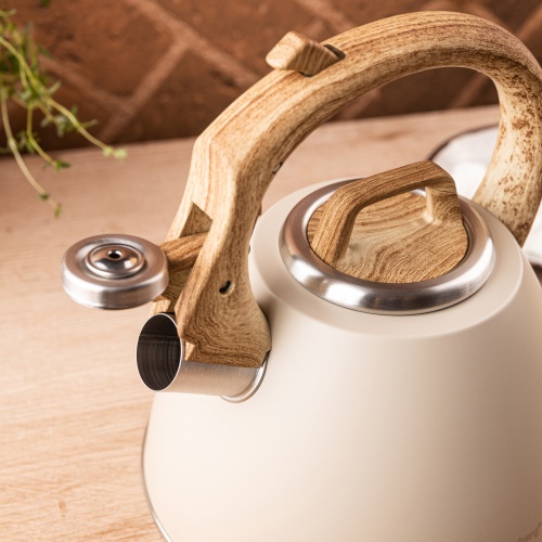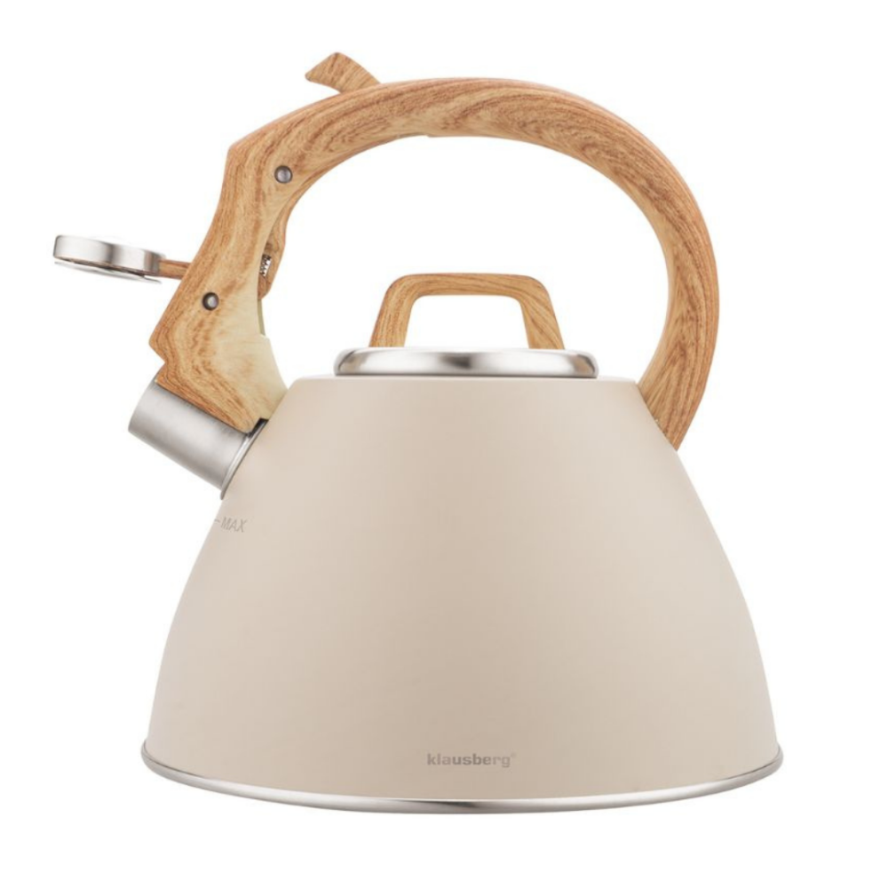KLAUSBERG KB-7954 is an elegant kettle with a matte beige finish and a handle imitating natural wood. It combines a decorative character with high functionality, making it a perfect fit for both modern and rustic interiors. Made of stainless steel, equipped with a Soft-Touch handle, whistle and button opening, it guarantees comfortable and safe everyday use.