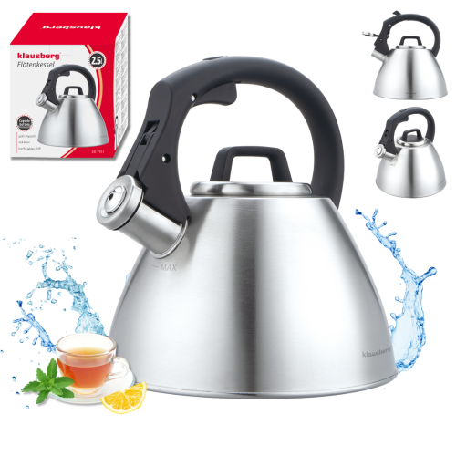 KLAUSBERG KB-7951 is an elegant kettle with a capacity of 2.5 liters, made of high-quality stainless steel. It is equipped with a practical whistle, a comfortable Soft-Touch handle and a multi-layer capsule bottom ensuring quick and even heating. Its satin finish makes it look great in any kitchen.