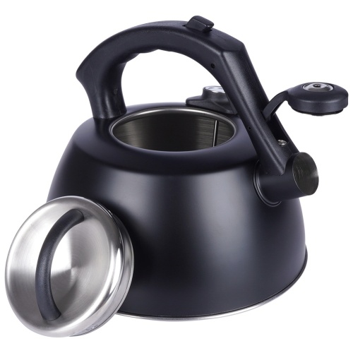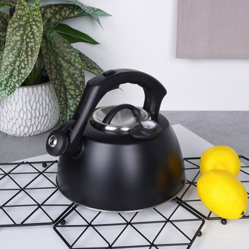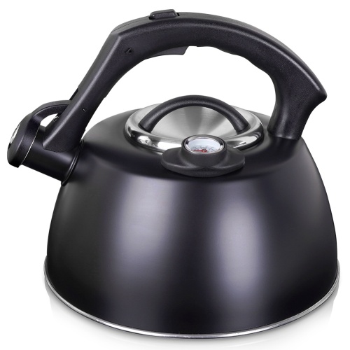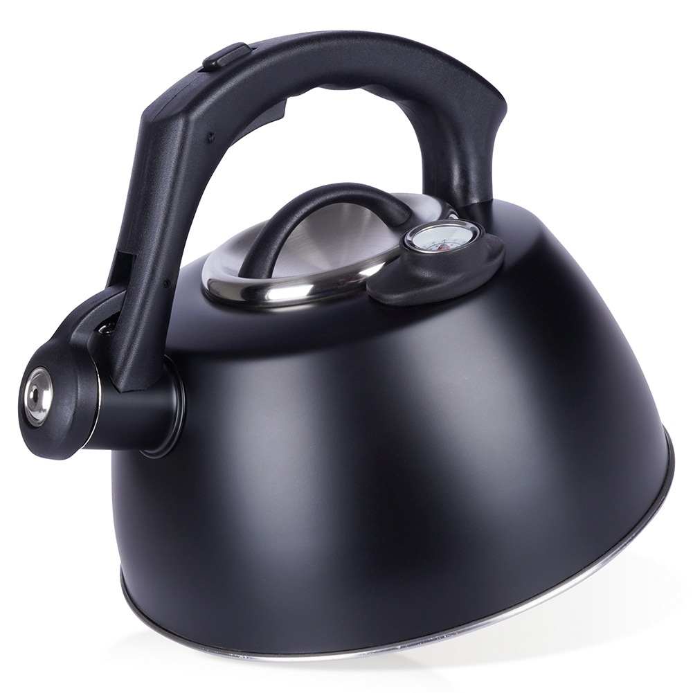 Kettle with automatic whistle and thermometer. Made of black stainless steel. For use on all types of cookers.