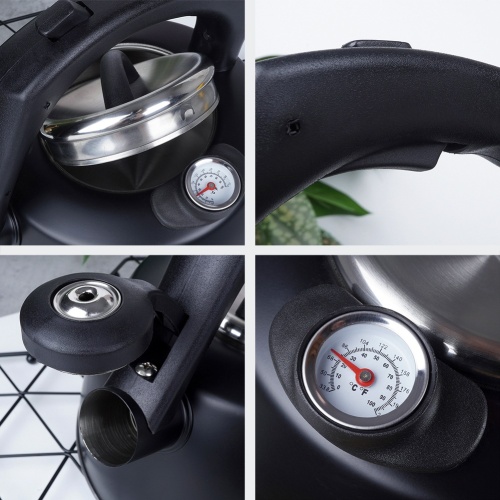- WITH THERMOMETER- The kettle is equipped with a thermometer with a clear scale from 33.8°F to +212°F and from 0°C to 100°C. The thermometer will allow you to select the right temperature for brewing tea or herbs. It also has an automatically opening whistle using a button in the handle, which will allow for comfortable use. Boil water signal with a whistle.