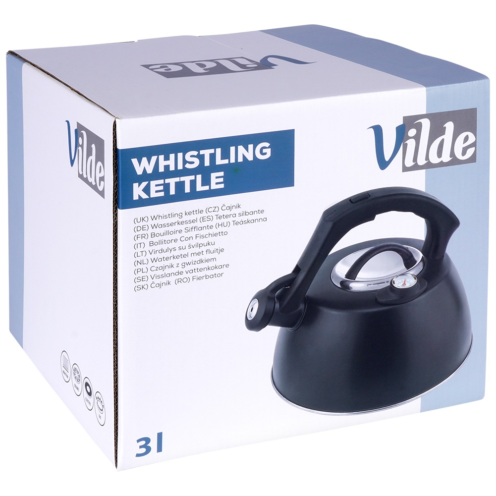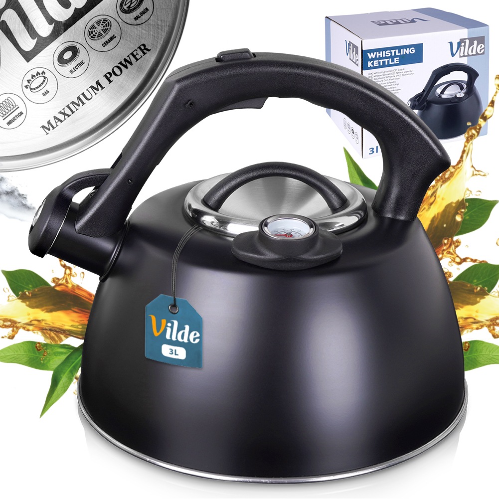 Kettle with a thermometer made of the highest quality materials. We will use it to boil water for coffee, tea or to brew herbs. Convenient to use thanks to the handle, lid and automatic whistle. The thermometer will allow you to brew teas and herbs at appropriate temperatures: black tea should be brewed at 90-95°C, green tea at 75-85°C, white tea at 70-80°C, yellow tea at 80-85°C, herbal tea at 95-100°C, herbs are best brewed at 95°C. We can boil water in the kettle very quickly, and cleaning it is very convenient. The kettle is a great gift idea. ATTENTION! The boiling kettle must be at least half full to prevent overheating. Color changes on the external surface in the event of non-compliance with the minimum performance parameters cannot be a reason for complaint.Original Vilde product.Manufactured in accordance with European standards.