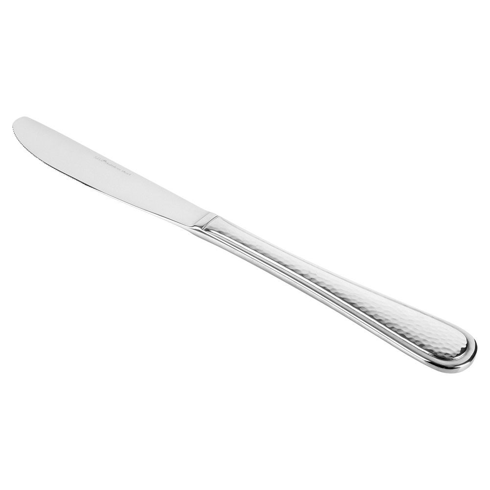 A set of three 23 cm long dinner knives. The knives are made of stainless steel in silver color, they have the effect of hammered steel. They are suitable for washing in a dishwasher.