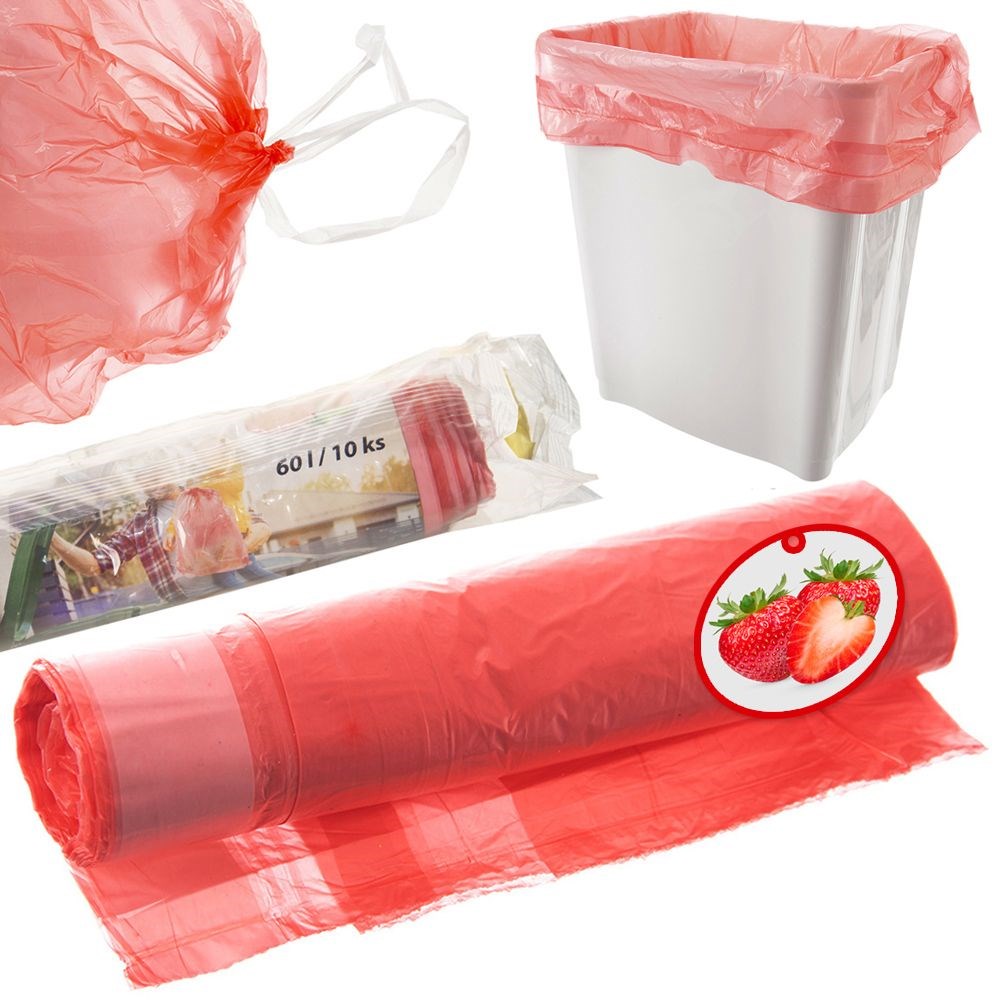 Set of 10 garbage bags with a capacity of 60 liters. Made of red HDPE. The bags have a strawberry scent and are equipped with a drawstring.
