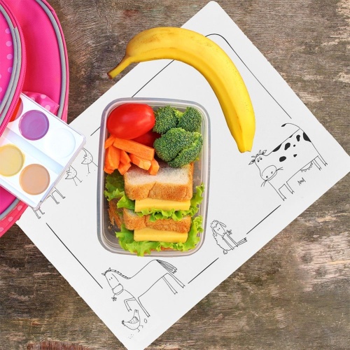 Rectangular table mat made of white plastic with animal decor. It is a beautiful background for tableware and cutlery.