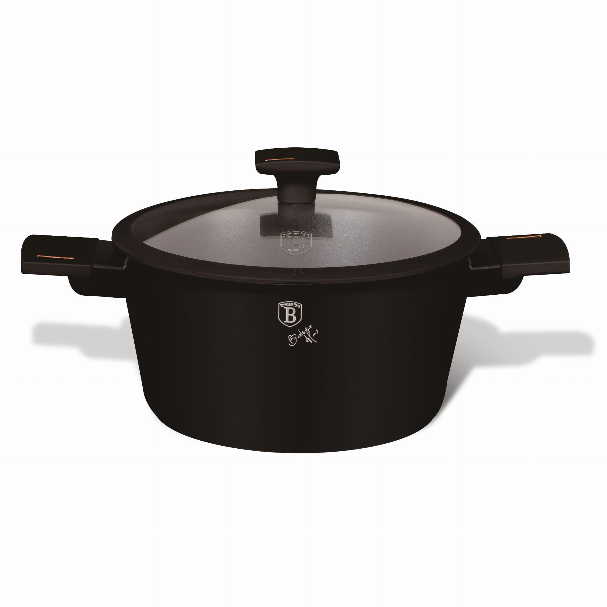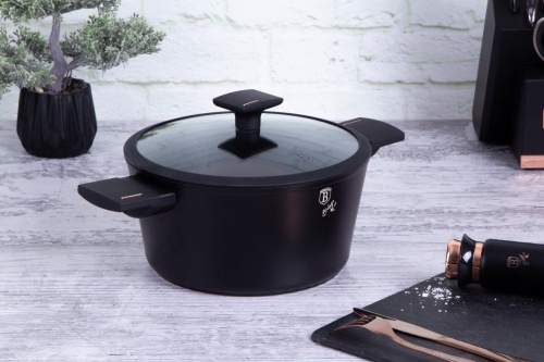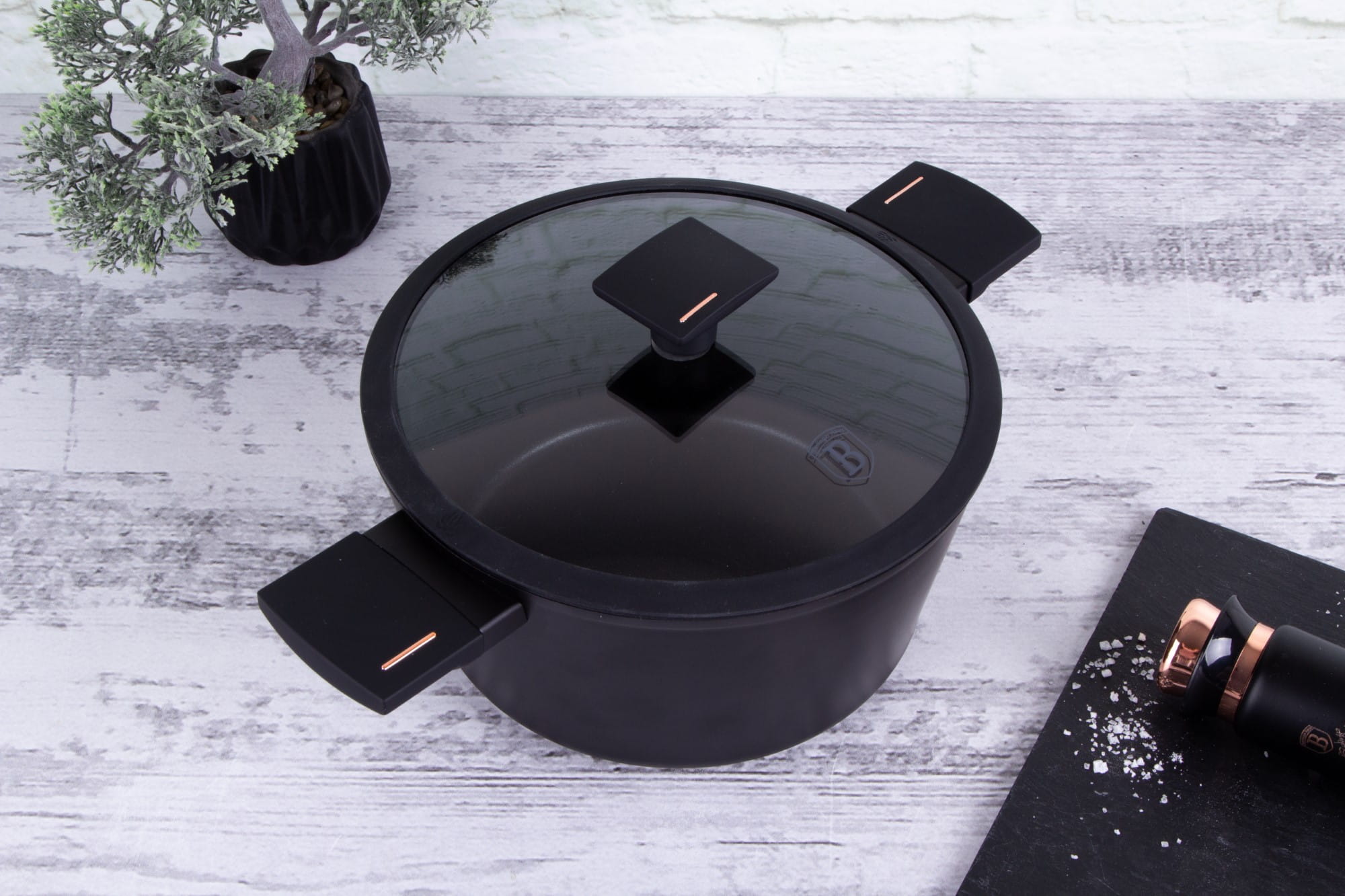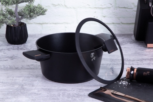 BERLINGER HAUS 24cm diameter cookware from the MONACO series, the cookware from this series is made of high-quality forged aluminium coated inside with titanium coating with a very high hardness coefficient. The outer coating in matt black. These attractive and fashionable cookware are equipped as standard with SOFT TOUCH handles (silicone grip) and are suitable for all types of cookers: gas, electric, ceramic, halogen, induction.