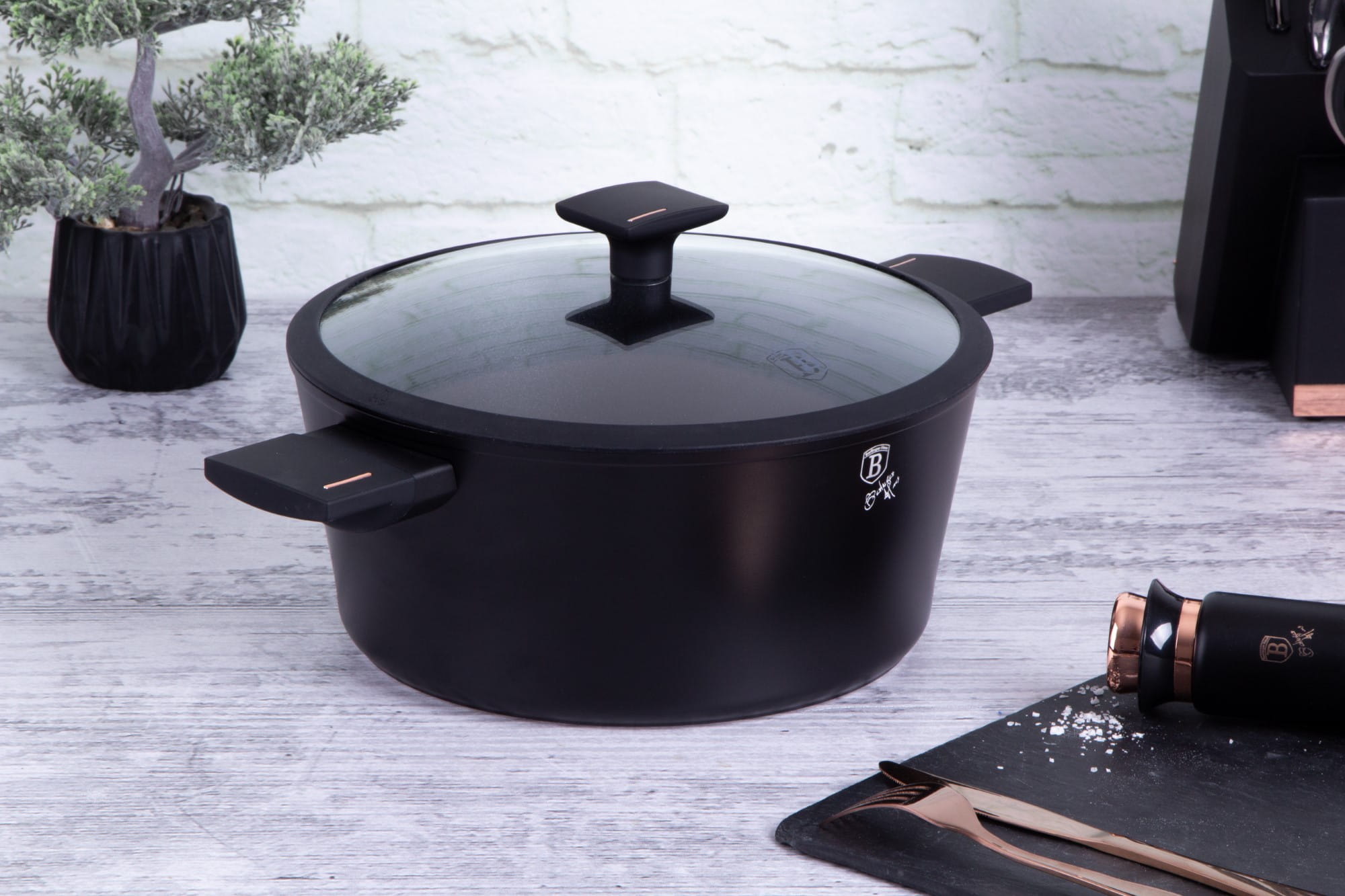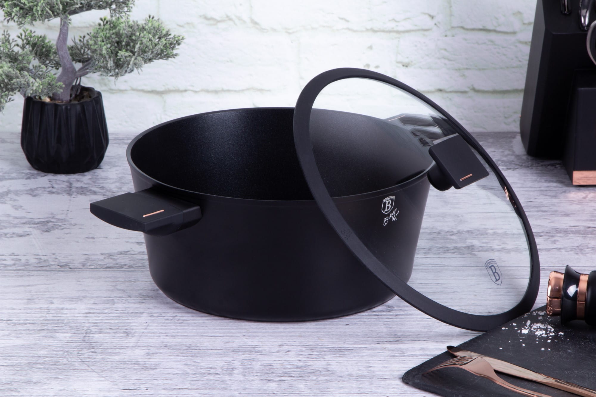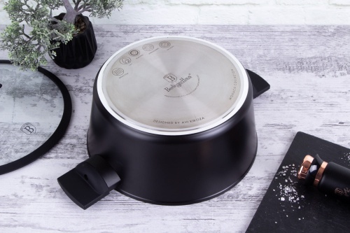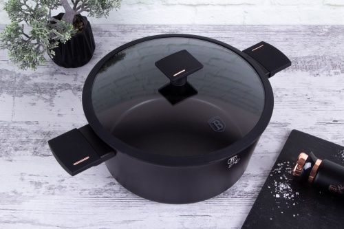 BERLINGER HAUS 28cm diameter cookware from the MONACO series, the cookware from this series is made of high-quality forged aluminium coated inside with titanium coating with a very high hardness coefficient. The outer coating in matt black. These attractive and fashionable cookware are equipped as standard with SOFT TOUCH handles (silicone grip) and are suitable for all types of cookers: gas, electric, ceramic, halogen, induction.