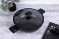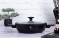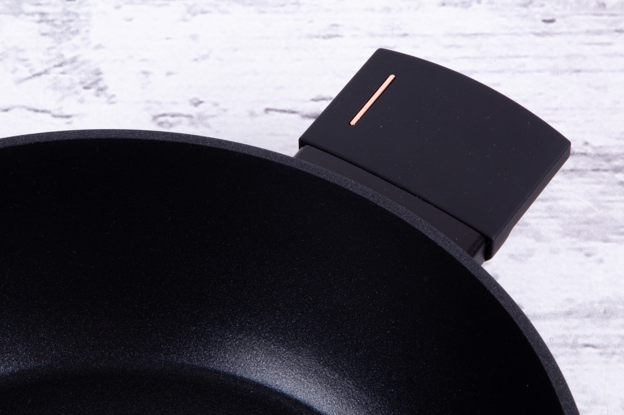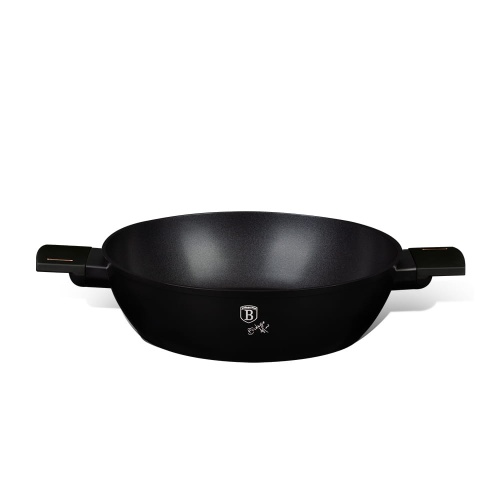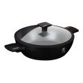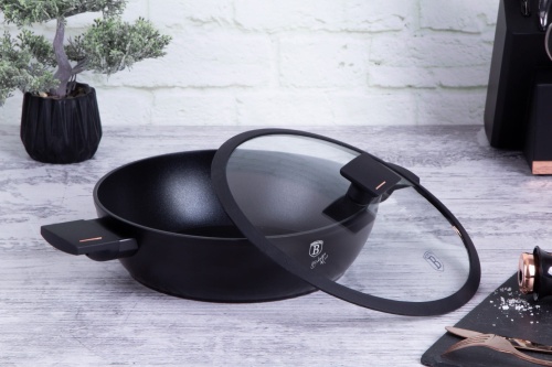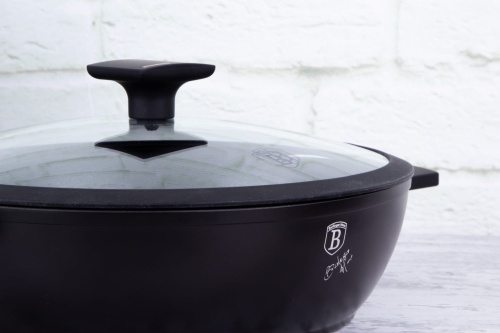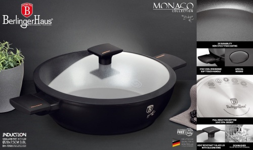 BERLINGER HAUS low pot with a diameter of 28cm from the MONACO series, dishes from this series are made of high-quality forged aluminium coated inside with titanium coating with a very high hardness coefficient. The outer coating in matt black. These attractive and fashionable cookware are equipped as standard with SOFT TOUCH handles (silicone grip) and are suitable for all types of cookers: gas, electric, ceramic, halogen, induction.