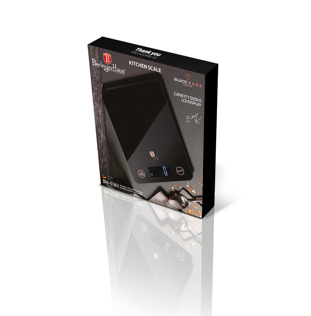 Super płaska waga kuchenna BERLINGER HAUS. Praktyczna i estetyczna w kolorystyce linii BLACK ROSE, wykonana ze szkła hartowanego.