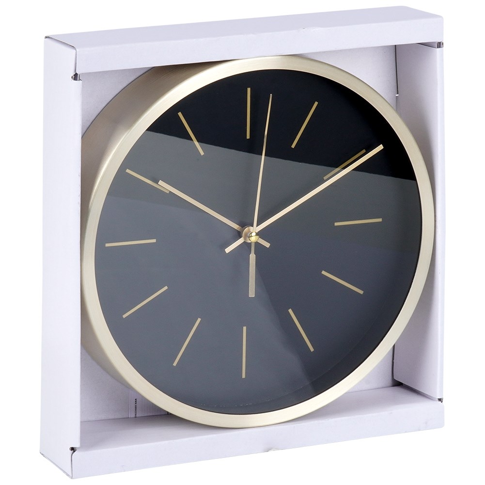 A unique wall clock with a diameter of 25 cm. Designed in a classic style. It has a black dial and a gold frame and hands.