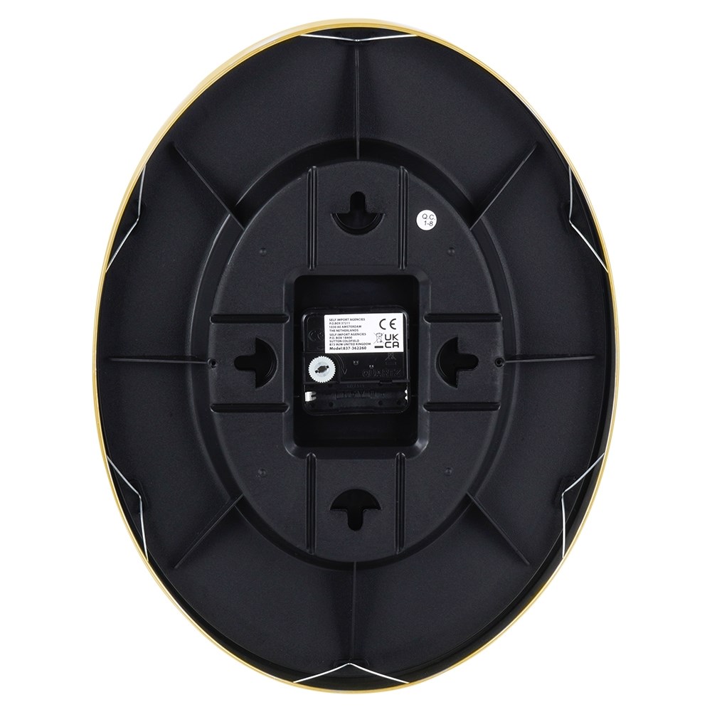 Oval wall clock with thermometer and hygrometer. It has a classic design. It will look beautiful in any interior. A clock can be a great gift idea, e.g. for a housewarming party or a birthday. The classic style of the clock complements any interior design. Designed in a fashionable combination of gold and black. With its help, we can easily read the time, air temperature and humidity. Manufactured in accordance with European standards.