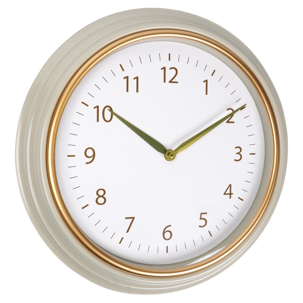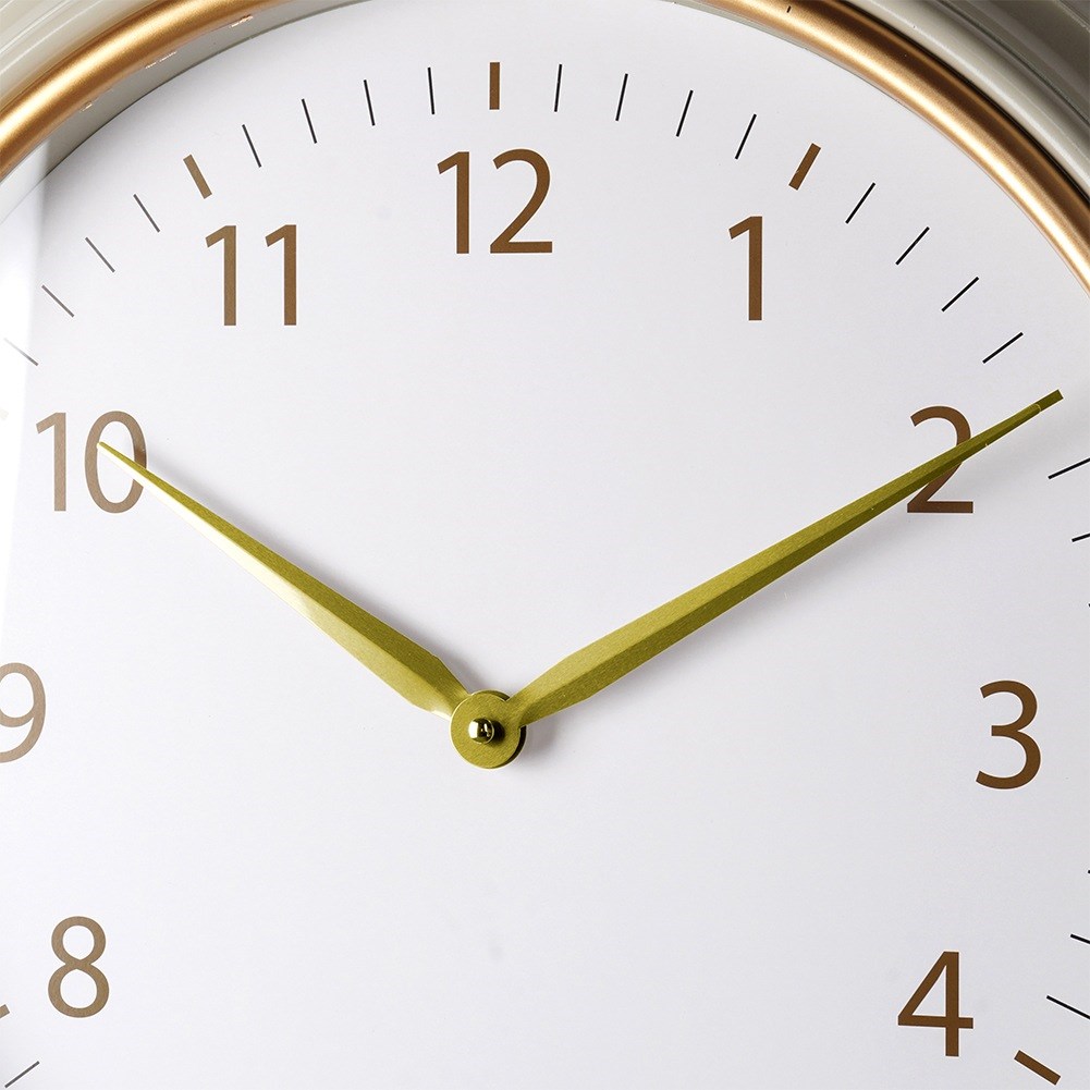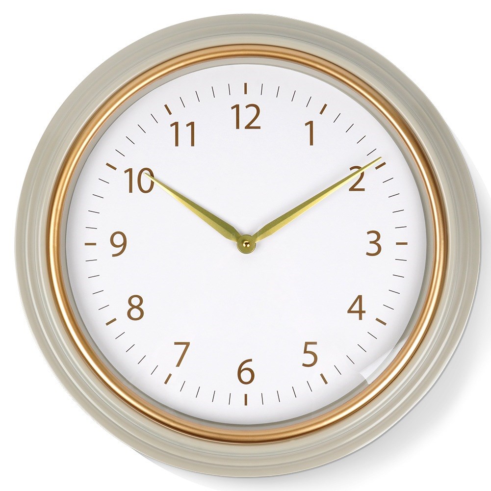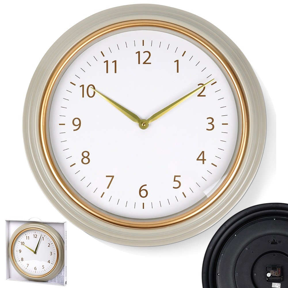 - White dial with gold numerals and hands- The clock frame is made of the highest quality beige plastic. The clock face is white. The dial surround, hands and numerals are gold.