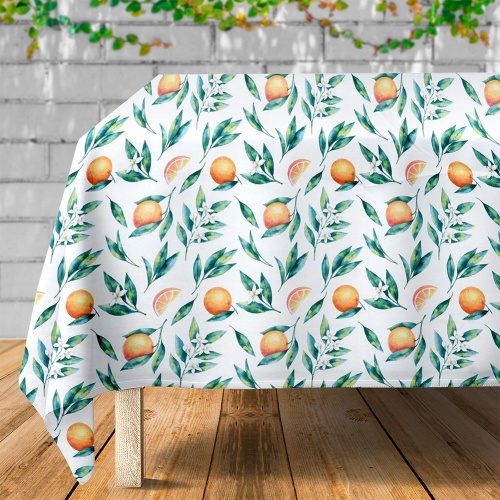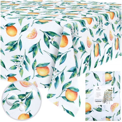 - Durable and dirt-resistant- Tablecloth made of white polyester with orange leaves and fruits. Practical for everyday use and perfect for special occasions.