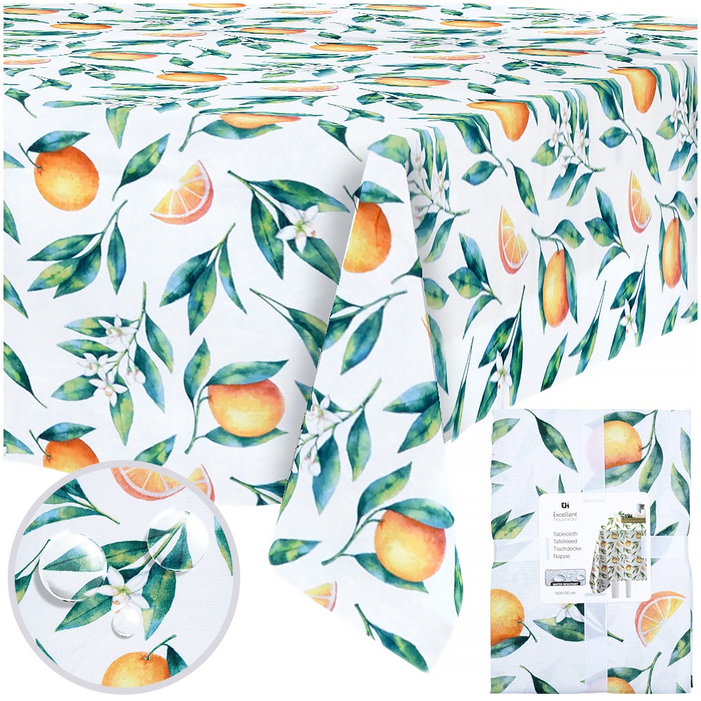 Waterproof tablecloth with an orange motif. The special coating does not absorb water. It has a rectangular shape and dimensions 180x130 cm. Perfect for everyday use and for special occasions.