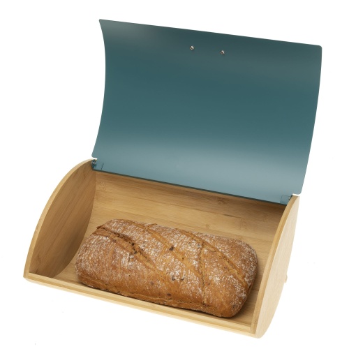 The bread box is made of bamboo wood and the lid is made of stainless steel.