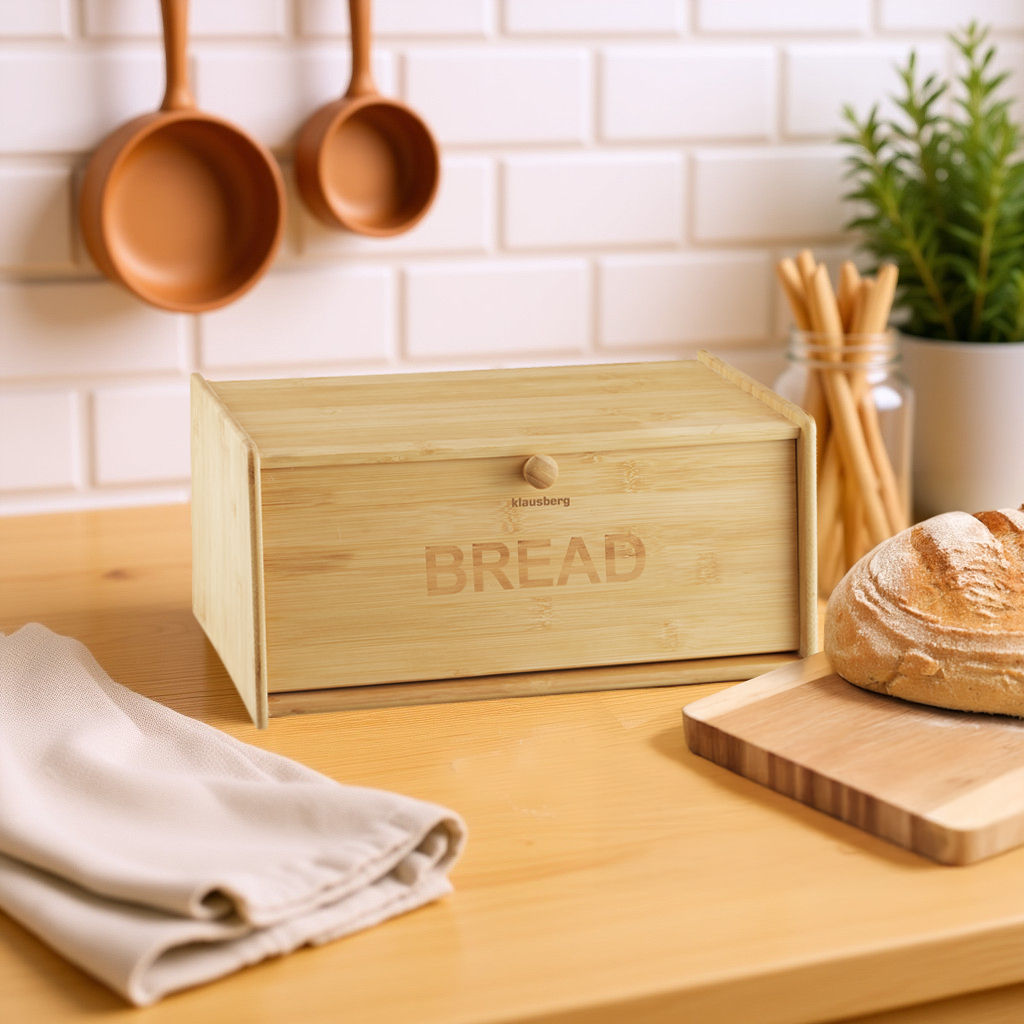 Classic wooden haversack by KLAUSBERGmade of natural bamboo - a light, durable and environmentally friendly material. Subtle inscriptionBREADon the front and a simple, timeless design make the bread box fit perfectly into kitchens decorated in a Scandinavian, rustic or minimalist style.