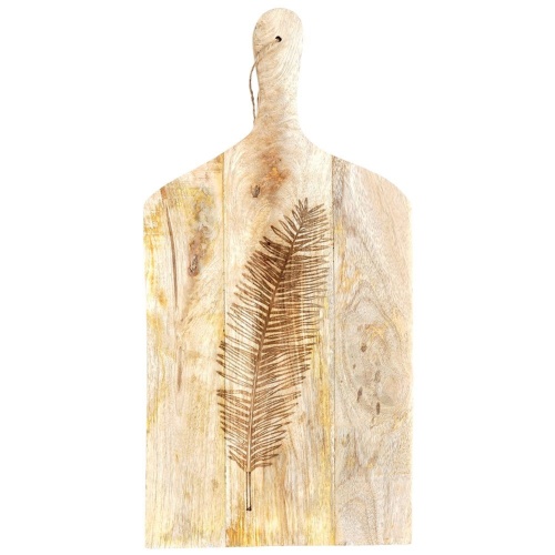 Cutting and serving board. Made of exotic mango wood, it has attractive grooves. Equipped with a handy handle and a string that makes hanging it easier.