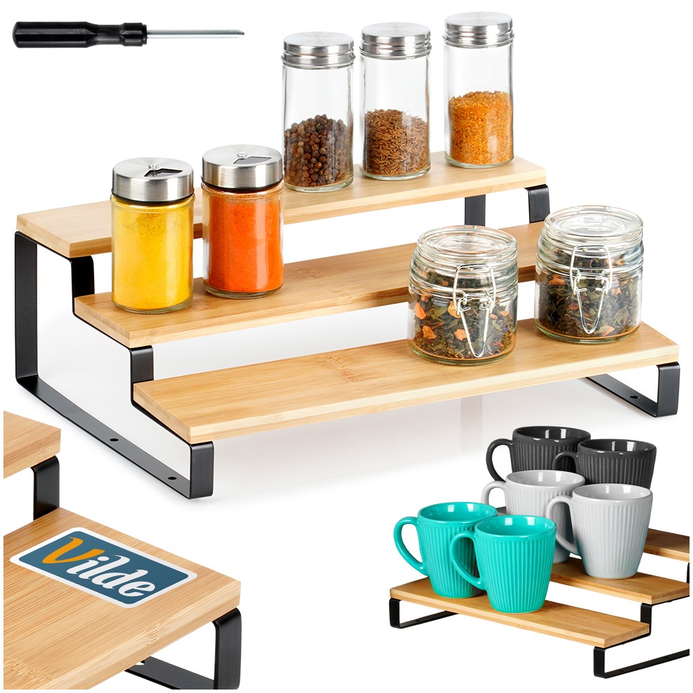 A practical kitchen shelf that will allow you to store kitchen spices and accessories on three levels. Ideal to organize the space in the kitchen. It can be used e.g. on a kitchen counter, gaining an additional space. The shelf is extremely versatile and will work in various interior arrangements.Original VILDE product.Manufactured in accordance with European standards.