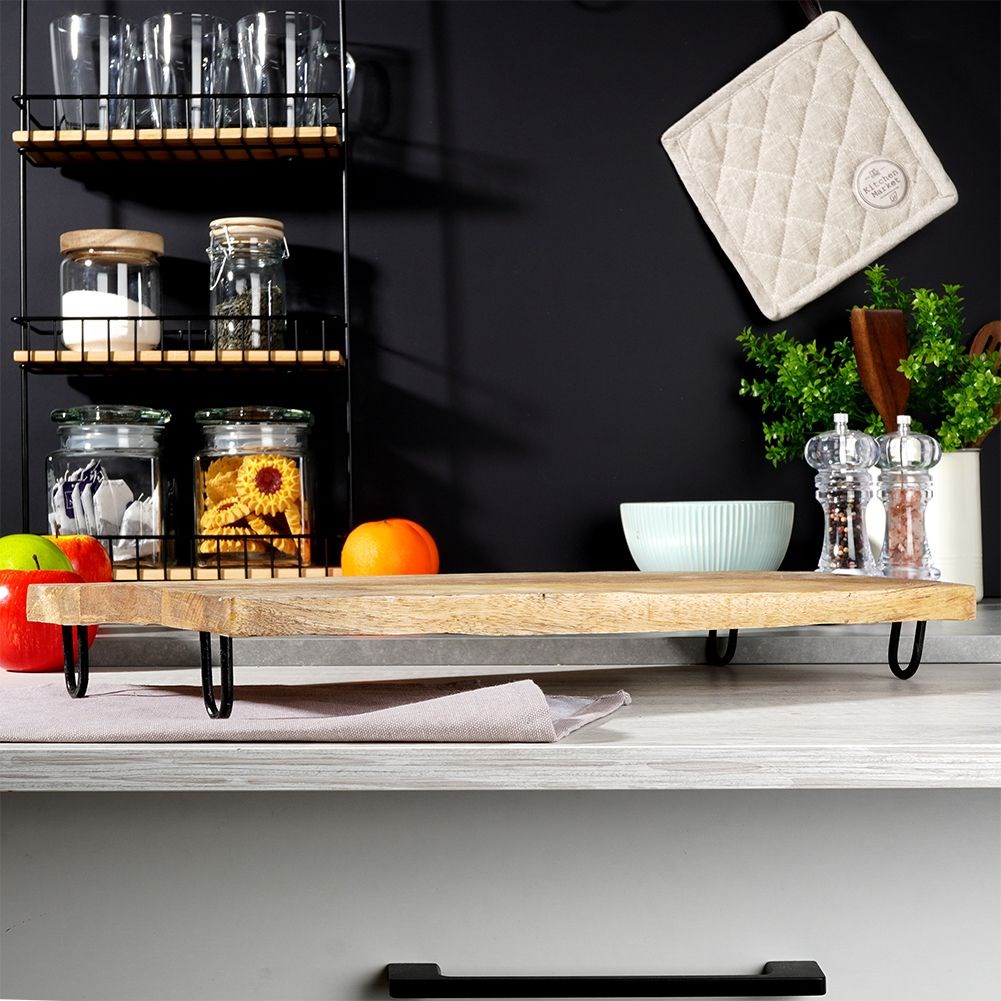 A wooden board with metal legs for serving dishes, snacks, appetizers, etc. Made of exotic mango wood.