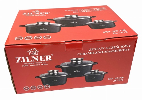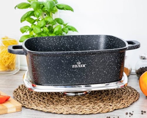 Komplet 3 garnków kwadratowych (brytfann) EDEL HOFF / ZILNER pokrytych marmurową ceramiczną powłoką nieprzywierającą. Zestaw posiada pokrywki szklane z uchwytem Aroma Knob w którym umieszczono dozownik oleju, dzięki któremu podczas gotowania lub duszenia można podawać olej lub płynne przyprawy. Garnki wykonane ze stopu aluminium posiadają indukcyjne ferromagnetyczne dno. Przystosowane do współpracy z każdym rodzajem kuchni, włącznie z indukcyjną.