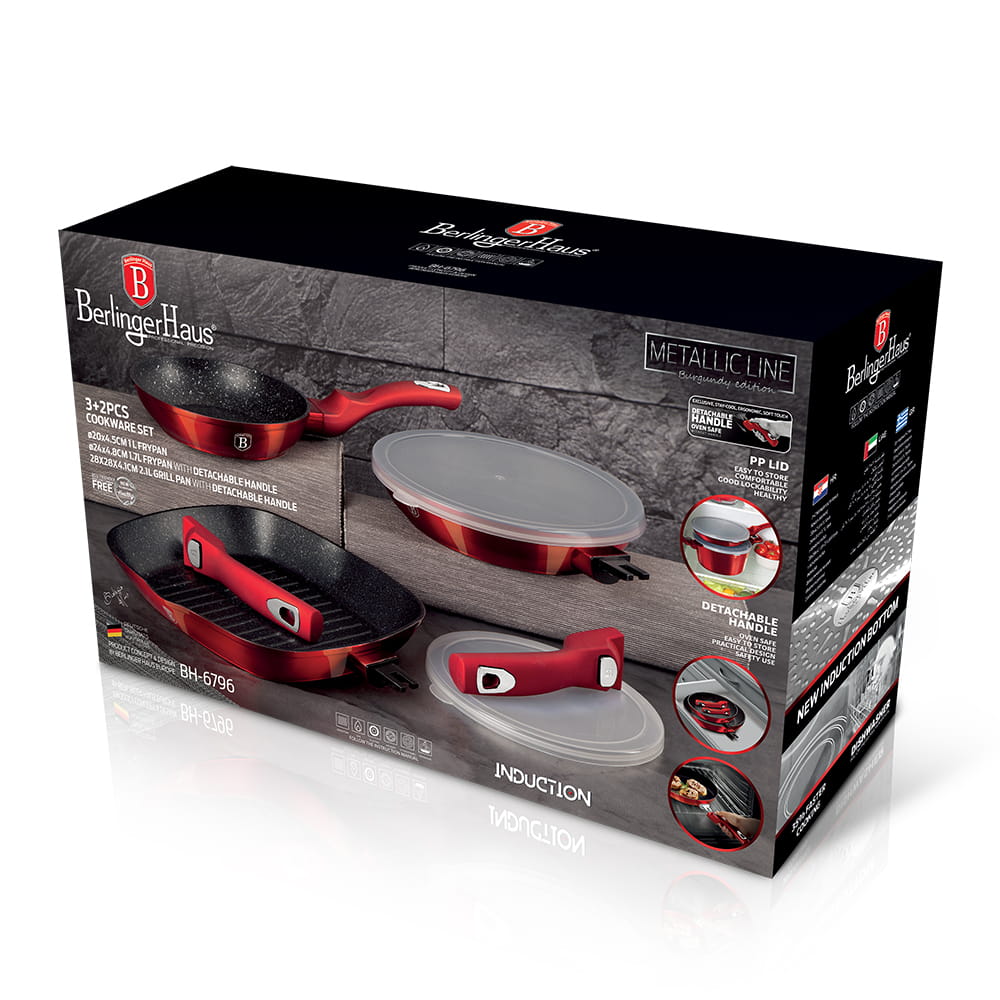 Garnki i akcesoria z serii METALLIC firmy BERLINGER HAUS wykonane są z wysokiej klasy kutego aluminium pokrytego wewnątrz potrójną powłoką granitową (marble) o bardzo wysokim współczynniku twardości. Powłoka zewnętrzna występuje w kilku wersjach kolorystycznych o charakterystycznym metalicznym połysku. Te atrakcyjne i modne naczynia wyposażone są standardowo w uchwyty typu SOFT TOUCH (silikon handle). Przystosowane do wszystkich rodzajów kuchenek: gazowa, elektryczna, ceramiczna, halogenowa, indukcyjna. System TURBO INDUCTION (bardzo szybko nagrzewają się) pozwala zaoszczędzić nawet 35% energii.
