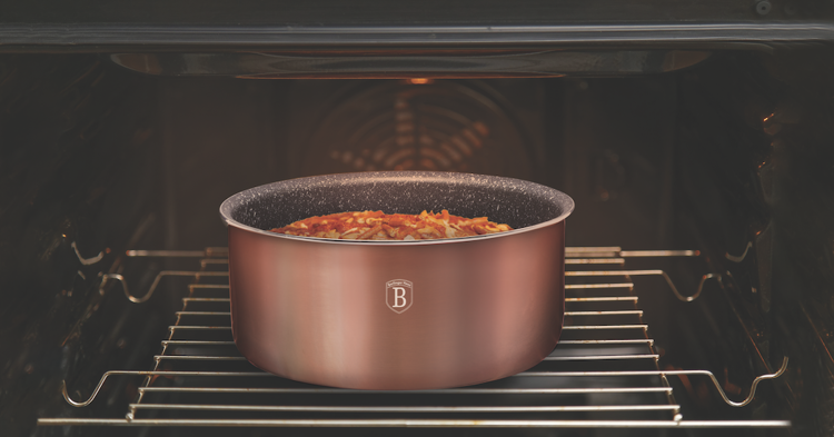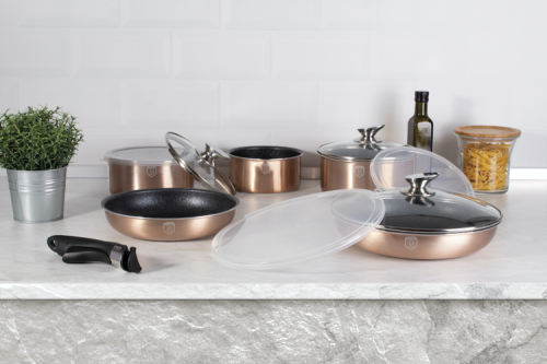 Najwyższej jakości zestaw garnków aluminiowych 12 ele. BERLINGER HAUS z serii COPPER z unikalną powłoką tytanową oraz odpinaną rączką w systemie Click it. Przystosowane do wszelkiego typu kuchenek, także do indukcyjnych.