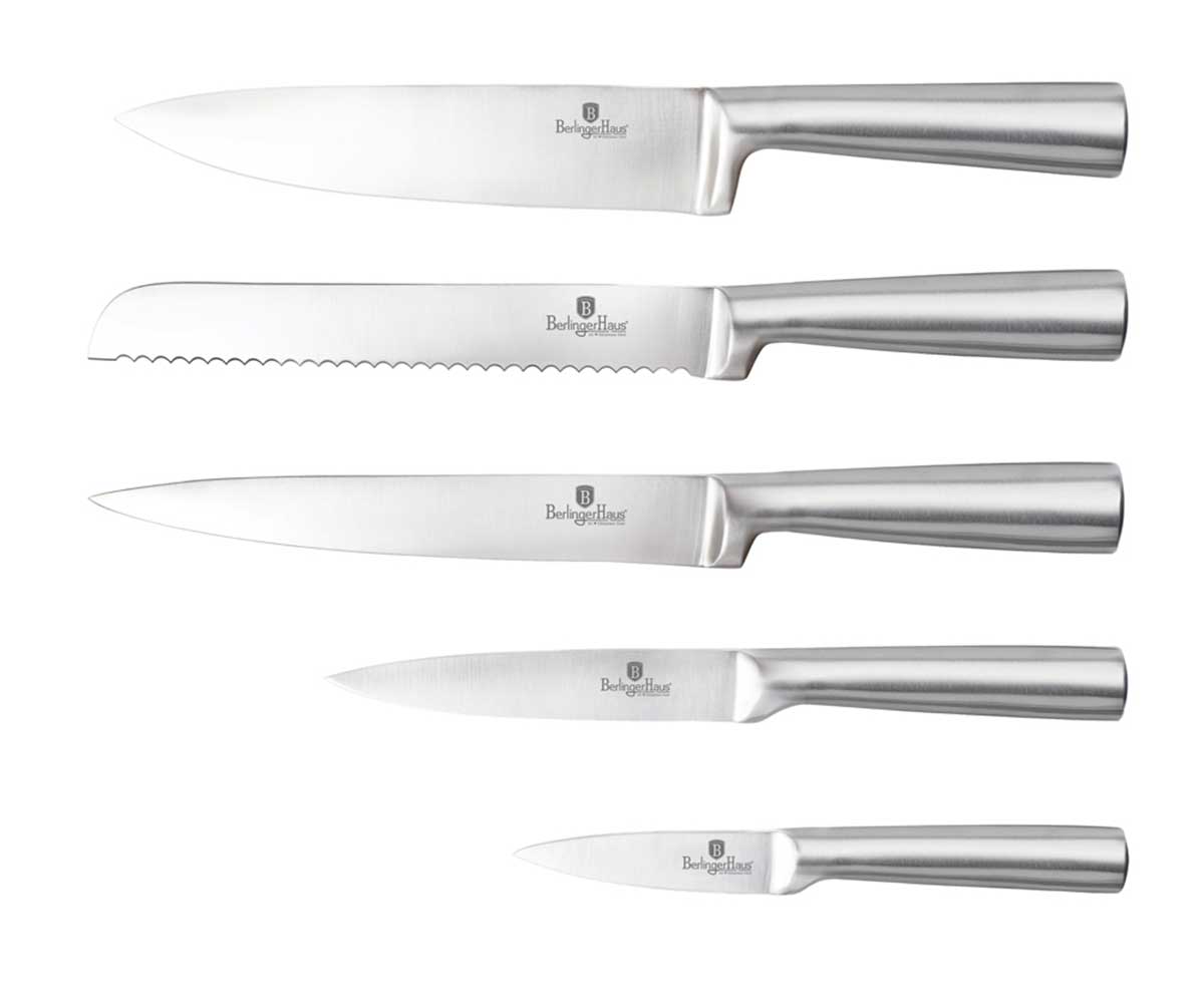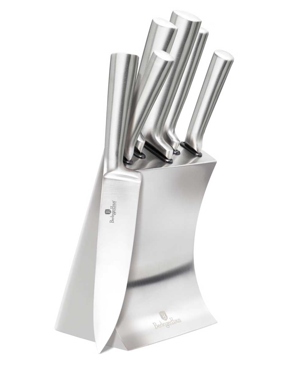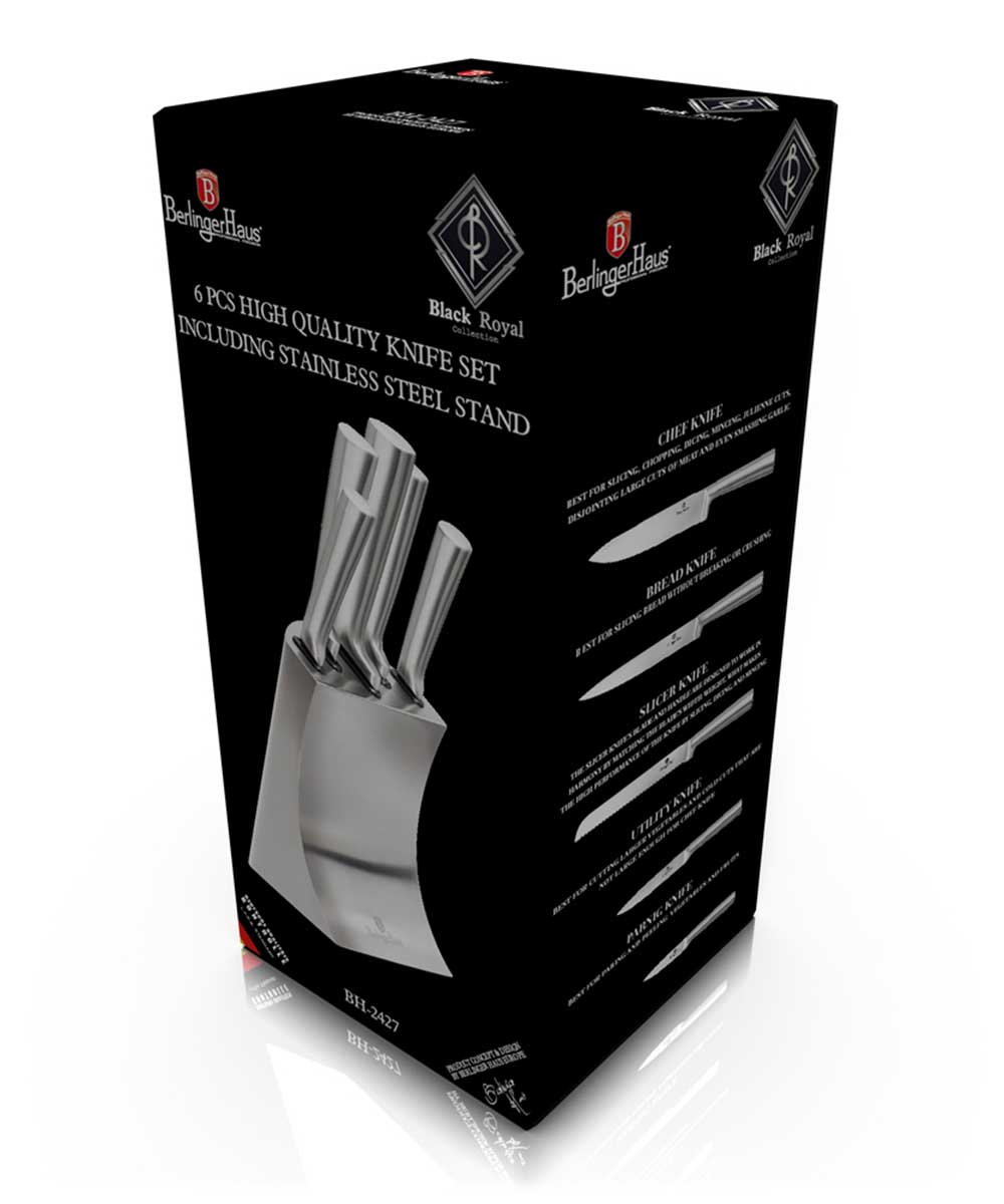 6 elementowy zestaw noży na stojaku ze stali szlachetnej firmy BERLINGER HAUS z serii BLACK ROYAL. Wysokiej klasy kompletny zestaw ogólnego przeznaczenia. Przeznaczone do porcjowania mięsa i ryb, krojenia pieczywa oraz siekania warzyw. Noże wykuwane z wysokogatunkowej nierdzewnej stali japońskiej. Ostrzone laserowo. Stojak ze stali nierdzewnej w kolorze srebrnym.