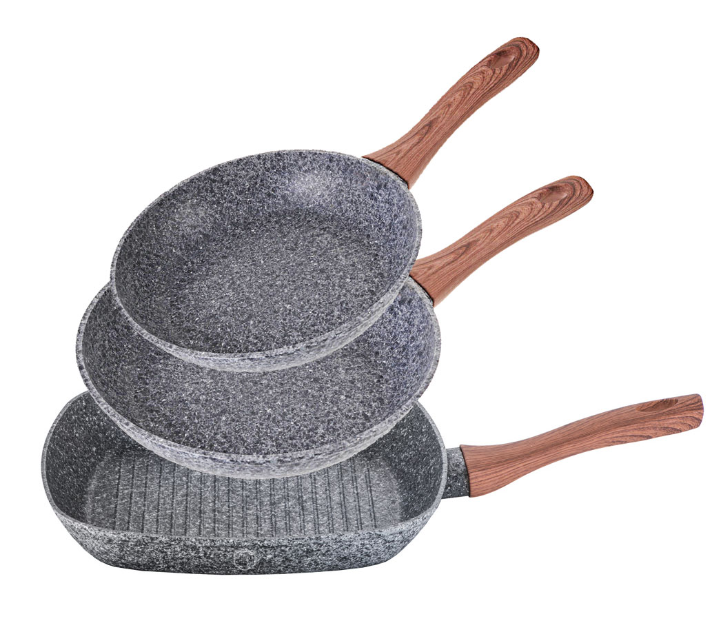 3 częściowy zestaw patelni BERLINGER HAUS z kolekcji FOREST LINE. Patelnie: Ø20cm, Ø24cm, grill 28 x 28cm.
