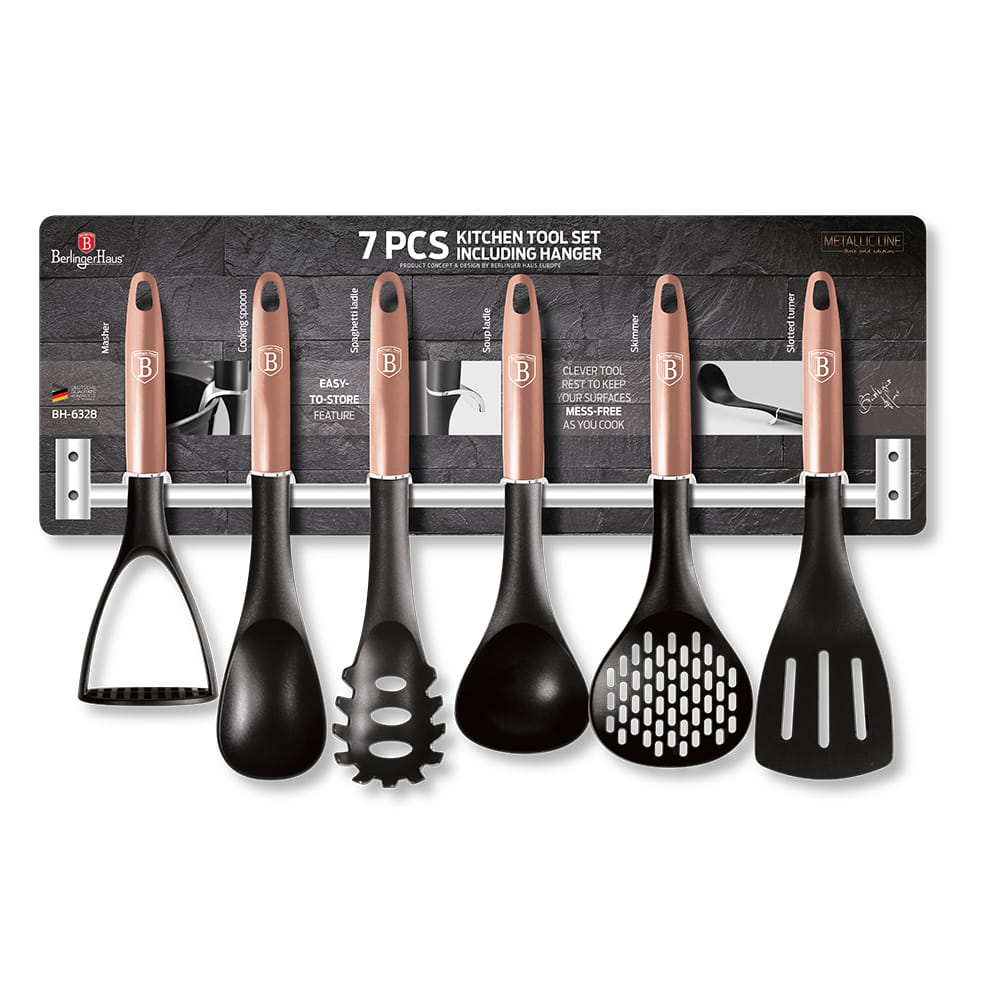Zestaw nylonowych przyborów kuchennych (7 elementów) firmy BERLINGER HAUS z serii ROSE GOLD.