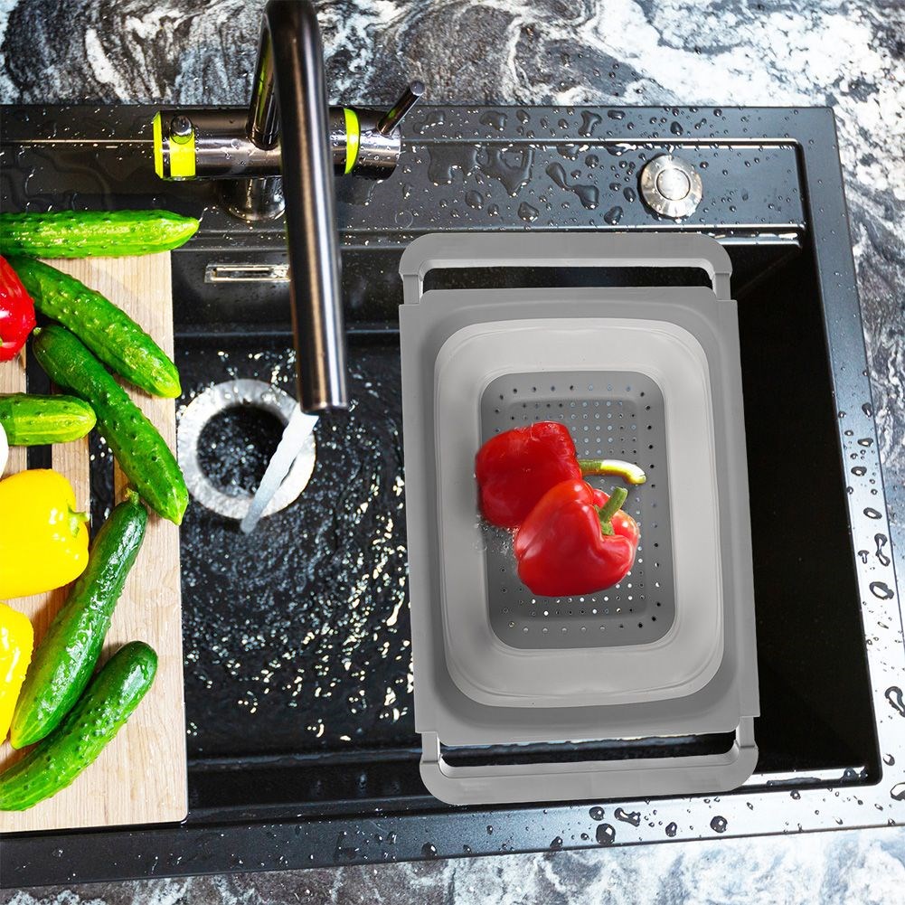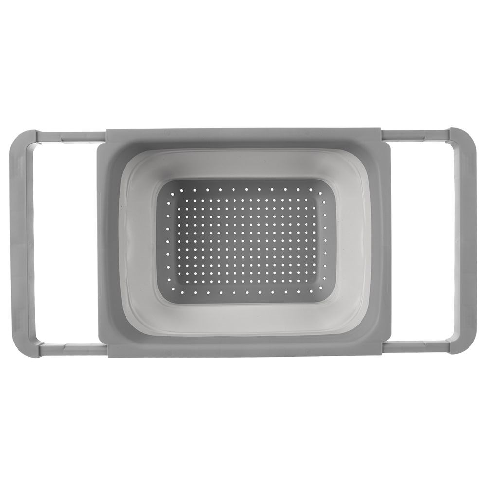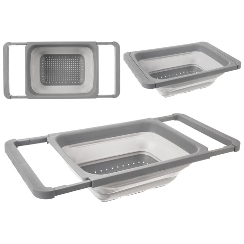 Składany cedzak kuchenny z rozsuwanymi uchwytami. Wykonany z tworzywa oraz termoplastycznego silikonu w kolorze szarym. Możemy wygodnie umocować go na zlewie.