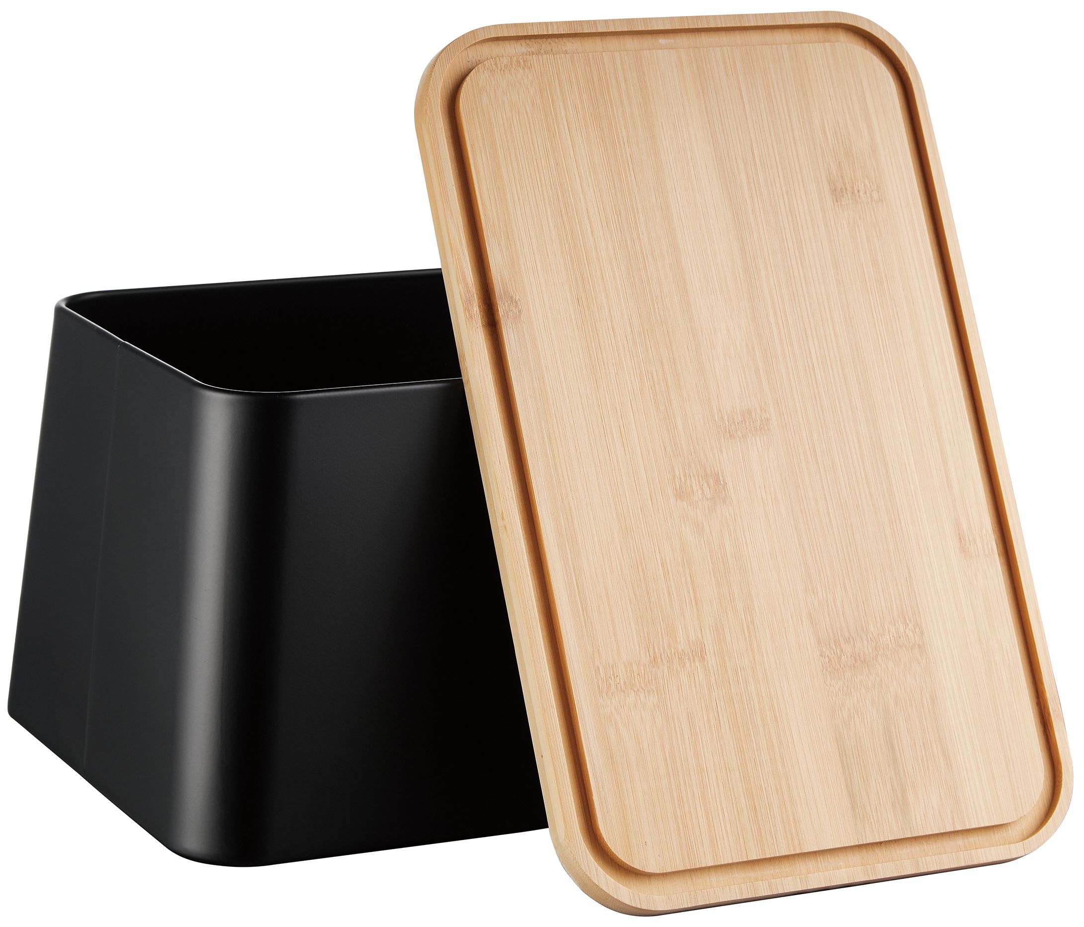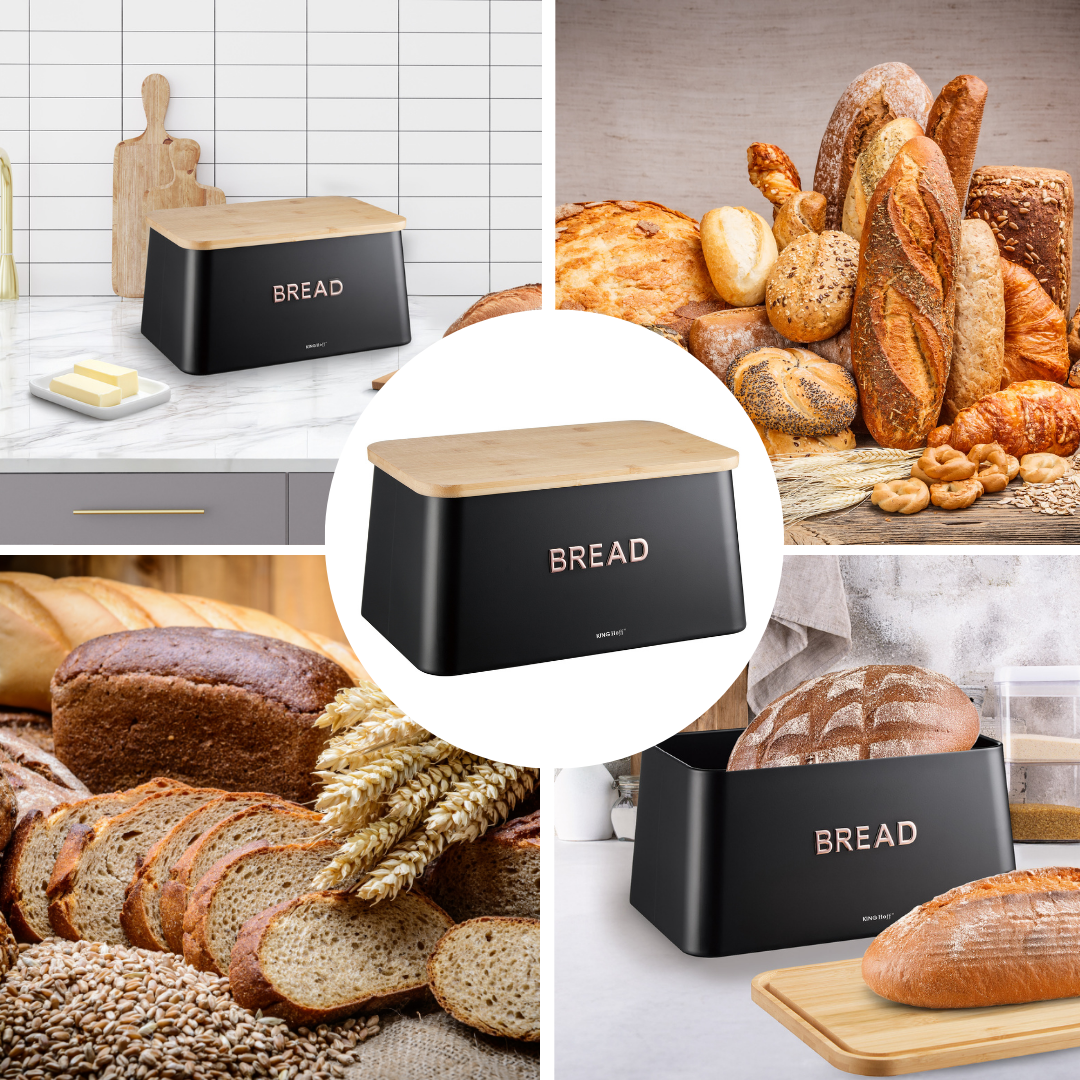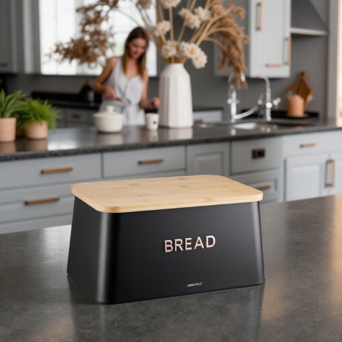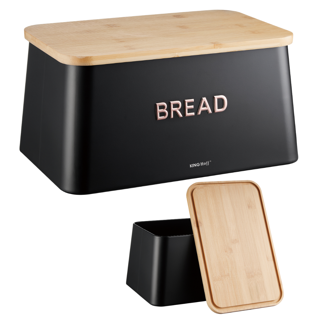 Chlebak z pokrywą-deską do krojenia marki KINGHoff łączy elegancki design z praktycznym zastosowaniem. Wykonany z wysokiej jakości metalu malowanego proszkowo w głębokim czarnym kolorze oraz wyposażony w naturalną bambusową pokrywę, doskonale wpisuje się zarówno w nowoczesne, jak i klasyczne wnętrza kuchenne.