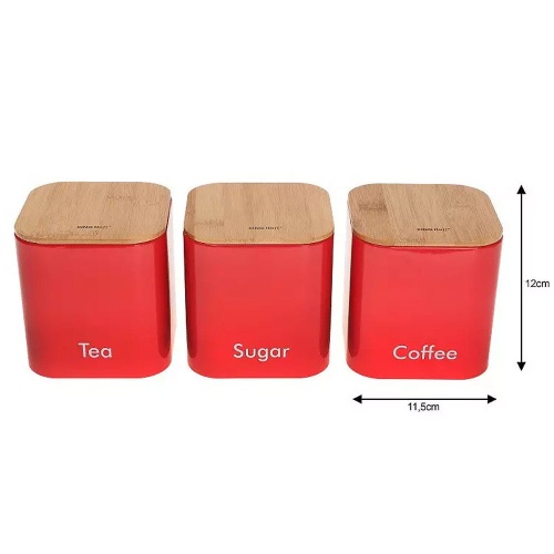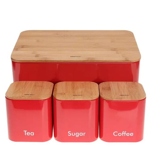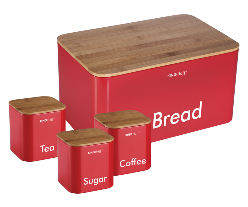 Elegancki zestaw w którego skład wchodzi chlebak oraz 3 pojemniki firmy KINGHOFF. Całość wykonana ze stali nierdzewnej, pokryta półmatowym lakierem. Pokrywa z drewna bambusowego łatwo otwiera się i zamyka oraz jednocześnie pełni funkcję deski do krojenia. Efektowna, praktyczna i zarazem solidna konstrukcja. Pojemniki posiadają szczelne pokrywki (także z drewna bambusowego) tak więc nadają się do szerokiego asortymentu. Podstawowe zastosowanie to herbata, kawa, cukier.