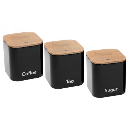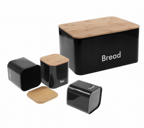 Elegancki zestaw w którego skład wchodzi chlebak oraz 3 pojemniki firmy KINGHOFF. Całość wykonana ze stali nierdzewnej, pokryta półmatowym lakierem. Pokrywa z drewna bambusowego łatwo otwiera się i zamyka oraz jednocześnie pełni funkcję deski do krojenia. Efektowna, praktyczna i zarazem solidna konstrukcja. Pojemniki posiadają szczelne pokrywki (także z drewna bambusowego) tak więc nadają się do szerokiego asortymentu. Podstawowe zastosowanie to herbata, kawa, cukier.