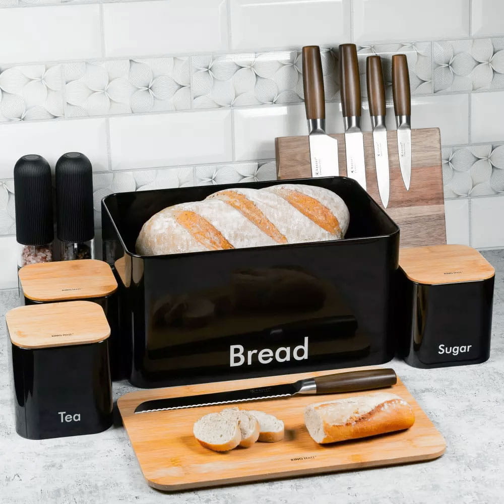 Elegancki zestaw w którego skład wchodzi chlebak oraz 3 pojemniki firmy KINGHOFF.
