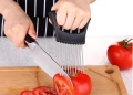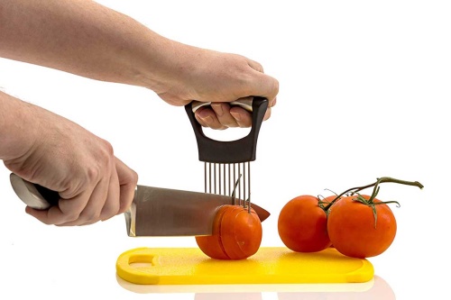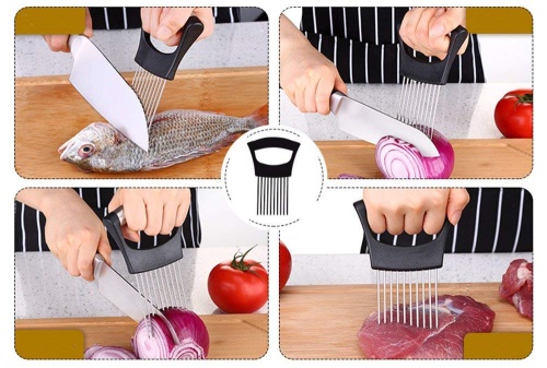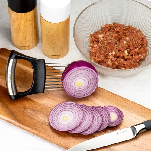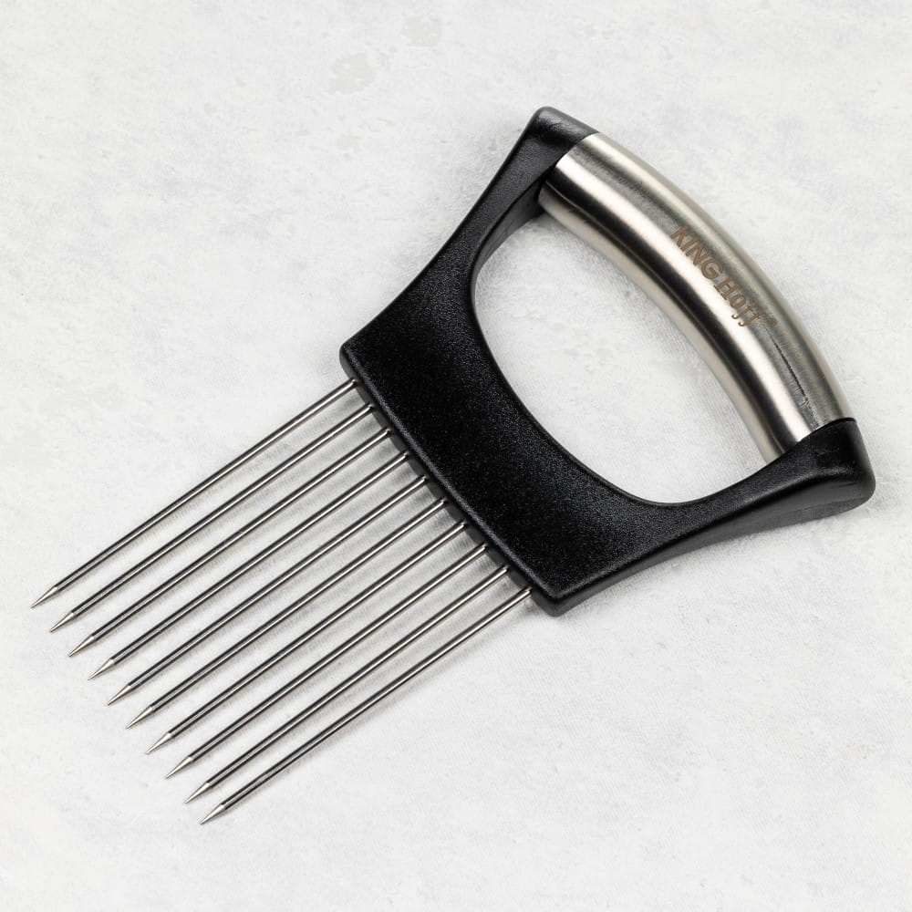 Chwytak do krojenia cebuli, pomidorów oraz innych warzyw wykonany ze stali nierdzewnej i tworzywa. Znajdzie także zastosowanie przy porcjowaniu mięsa oraz ryb. Można go wykorzystać również jako nakłuwacz do zmiękczania mięsa przed smażeniem lub pieczeniem.